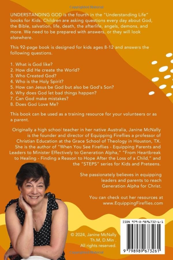 UNDERSTANDING GOD is the fourth in the “Understanding Life” books for Kids. Children are asking questions every day about God, the Bible, salvation, life, death, the afterlife, angels, demons, and more. We need to be prepared with answers, or they will look elsewhere. This book answers the following questions. 1. What is God like? 2. How did He create the World? 3. Who Created God? 4. Who is the Holy Spirit? 5. How can Jesus be God but also be God’s Son? 6. Why does God let bad things happen? 7. Can God make mistakes? 8. Does God Love Me? This book can be used as a training resource for your volunteers or as a parent.