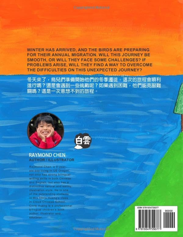 Winter has arrived, and the birds are preparing for their annual migration. Will this journey be smooth, or will they face some challenges? If problems arise, will they find a way to overcome the difficulties on this unexpected journey? Raymond Chen, a 9-year-old boy living in US Oregon, not only has strong bilingual writing skills in both Chinese and English, but also has a distinctive natural and earthy illustration style. He is one of the outstanding students in Mrs.Chris Huang’s class in Cloud Chinese School. Chris Huang is a professional bilingual children’s book author, illustrator and educator. Dong Tian Lai Liao ,Niao Er Men Zhun Bei Kai Shi Ta Men De Dong Ji Qian Xi . Zhe Ci De Lu Cheng Hui Shun Li Jin Xing Ma ?Huan Shi Hui Yu Dao Yi Xie Tiao Zhan Ni ?Ru Guo Yu Dao Kun Nan ,Ta Men Neng Ke Fu Nan Guan Ma ?Zhe Shi Yi Ci Yi Xiang Bu Dao De Lu Cheng .