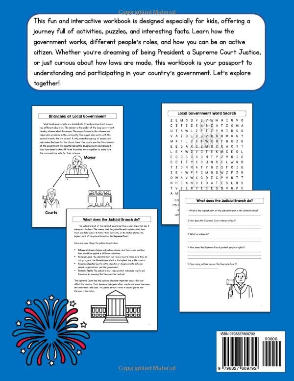 This workbook teaches students in grades 3-6 about the structure and function of the U.S. government and civic duties.