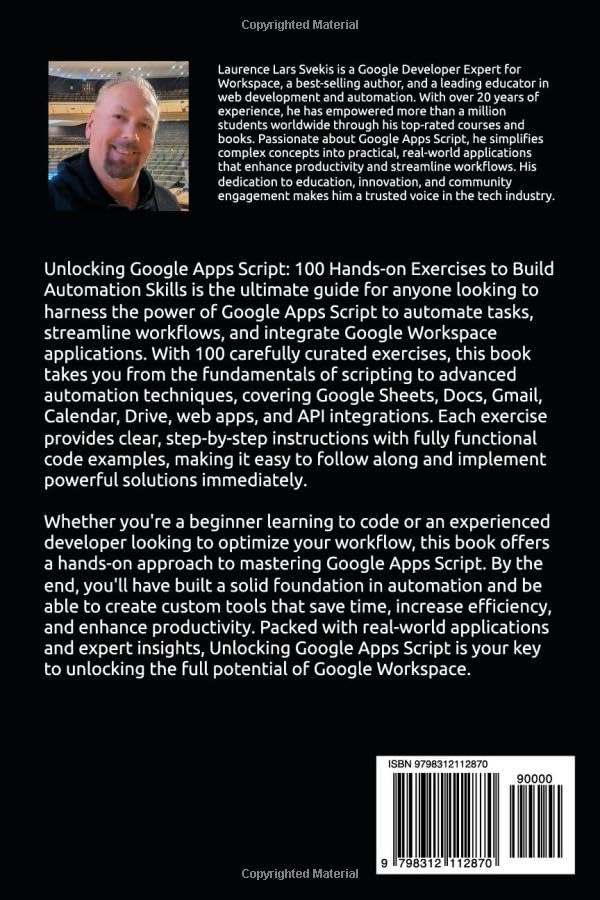 Take your Google Apps Script skills to the next level with Unlocking Google Apps Script–a hands-on, example-driven guide packed with 100 real-world exercises designed to help you master automation within Google Workspace. Whether you’re a beginner looking to get started with Apps Script or an experienced developer seeking advanced integration techniques, this book provides step-by-step guidance to automate tasks, build custom functions, and create powerful web apps. What You’ll Learn: Fundamentals of Apps Script – Get started with variables, loops, functions, and debugging techniques. Google Sheets Automation – Create custom functions, manipulate spreadsheets, generate charts, and automate reports. Google Docs & Gmail Automation – Generate dynamic documents, send automated emails, and organize your inbox programmatically. Google Drive & Calendar Automation – Manage files, schedule events, and streamline workflow processes. Web Apps & UI Development – Build interactive web apps, custom dialogs, and Google Workspace add-ons. Advanced Scripting & Integrations – Work with APIs, create triggers, handle authentication, and optimize performance. Who Is This Book For? Beginners – No prior experience? No problem! Learn by doing with clear examples and easy-to-follow explanations. Developers & Power Users – Enhance your productivity by automating repetitive tasks and integrating Google services seamlessly. Educators & Business Professionals – Streamline workflows, generate automated reports, and improve team collaboration with Apps Script. Each exercise includes detailed explanations, copy-and-run code samples, and practical use cases to reinforce your understanding. Whether you’re automating Google Sheets formulas, sending scheduled emails, or building interactive web applications, this book will equip you with the knowledge and hands-on practice you need to become proficient in Google Apps Script. Bonus: Access all source code examples on GitHub! Start automating today and unlock the full potential of Google Apps Script!