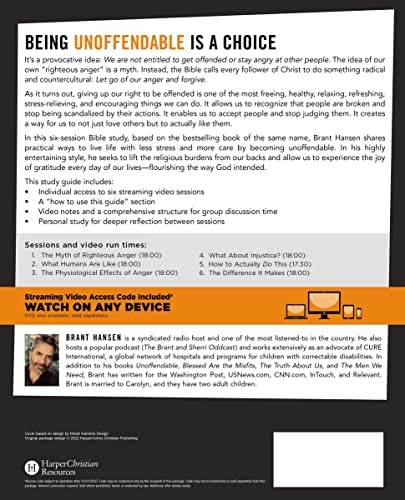 With deadpan humor and refreshing honesty, Brant Hansen will empower you to experience the joy and freedom of becoming unoffendable. Whether you’re scrolling through social media, sitting around the dinner table, or watching the news, it’s wrong not to be offended at the way things are in the world right now–right?! Bestselling author Brant Hansen has a different idea. What if “righteous anger” isn’t actually biblical? What if anger isn’t an effective response to injustice anyway? God does not need you to be angry. Instead, Christ calls us to do something radical and countercultural: Let go of your anger and forgive. In this six-session video Bible study (video access included), Hansen shares practical ways and biblical reasons to let go of anger and your “right” to be offended. Being unoffendable is a choice, and one that will help you flourish in the way God intended. Sessions and video run times: The Myth of Righteous Anger (18:00) What Humans Are Like (18:00) The Physiological Effects of Anger (18:00) What About Injustice? (18:00) How to Actually Do This (17:30) The Difference It Makes (18:00) This study guide has everything you need for a full Bible study experience, including: The study guide itself–with discussion and reflection questions, video notes, and a leader’s guide. An individual access code to stream all video sessions online. (DVD also sold separately) Streaming video access code included. Access code subject to expiration after 12/31/2027. Code may be redeemed only by the recipient of this package. Code may not be transferred or sold separately from this package. Internet connection required. Void where prohibited, taxed, or restricted by law. Additional offer details inside