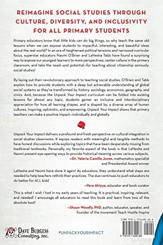 Reimagine social studies through culture, diversity, and inclusivity for all primary students Primary educators know that little kids can do big things. So why teach the same old lessons when we can expose students to impactful, interesting, and beautiful ideas about the real world? In an era of heightened political tensions and narrowed curricular focus, superstar educators Naomi O’Brien and LaNesha Tabb have found a surprising way to expose our youngest learners to more perspectives, center culture in the primary classroom, and take the need–and potential–for teaching about citizenship seriously: social studies! By laying out their revolutionary approach to teaching social studies, O’Brien and Tabb explain how to provide students with a deep but achievable understanding of global social systems as they’re transformed by history, sociology, economics, geography, and civics. And, because the Unpack Your Impact curriculum can be folded into existing lessons for almost any topic, students garner an inclusive and interdisciplinary appreciation for how all learning shapes, and is shaped by, a diverse array of human cultures. Inspiring, optimistic, and empowering, Unpack Your Impact shows that primary teachers can make a positive impact–individually and globally. Unpack Your Impact delivers a profound and fresh perspective on cultural integration in social studies classrooms. It equips readers with meaningful and tangible methods to have honest discussions while exploring topics that have been desperately missing from traditional textbooks. Personally, my favorite aspect of the book is that LaNesha and Naomi present eye-opening ways to provide historical meaning across various subjects. –Dr. Valerie Camille Jones, mathematics specialist and Presidential Award winner LaNesha and Naomi have done it again! As educators, they understand what steps are needed to help teachers rethink their practices. The duo continues to push educators to do better for ALL kids! –Vera Ahiyya, educator and book curator This is what I wish I had in my early years of teaching. It is practical, inspiring, relevant, and needed! I encourage all educators to read this book and learn from two of the best! –Shaun Woodly, PhD, author, educator, speaker, and found of the movement Teach Hustle Inspire