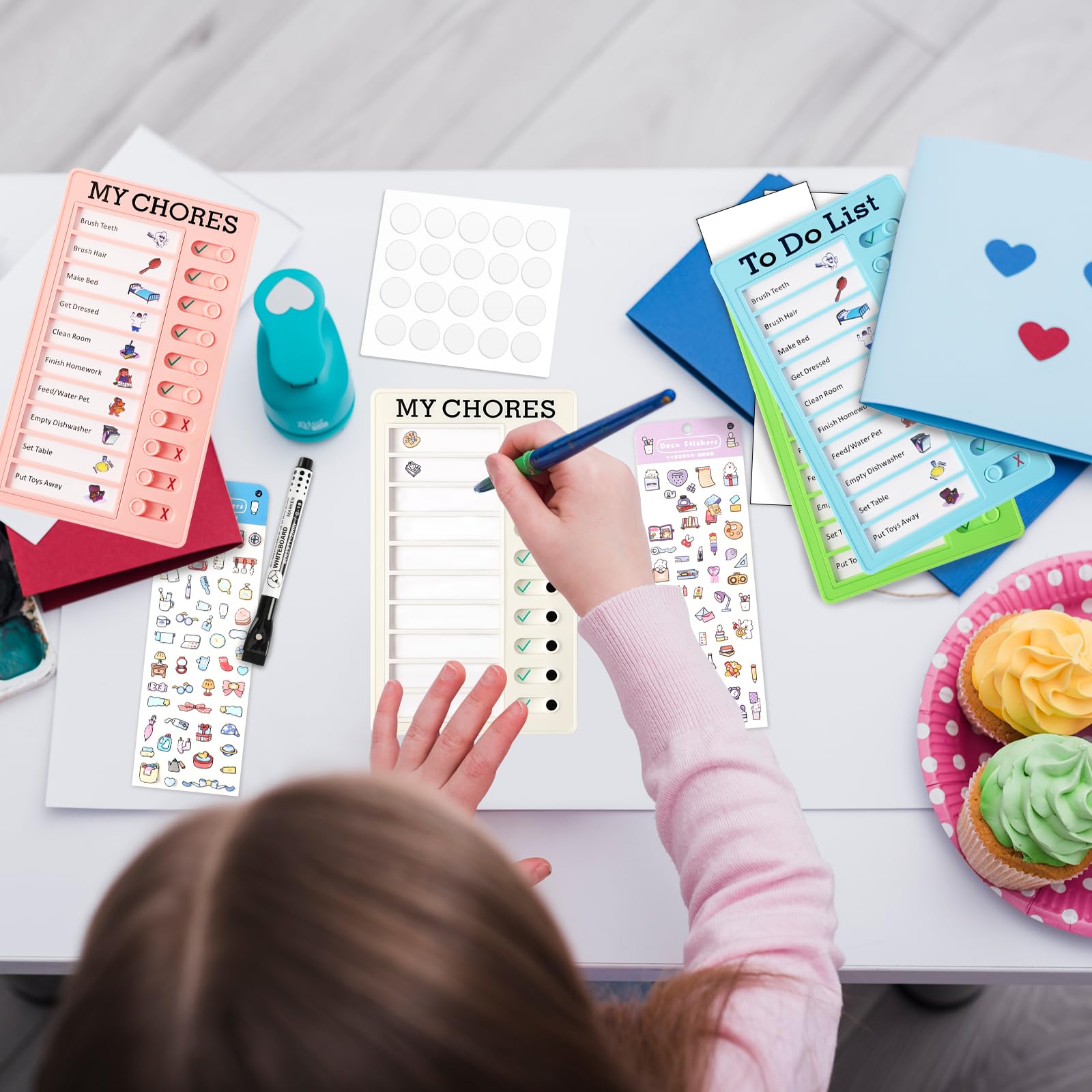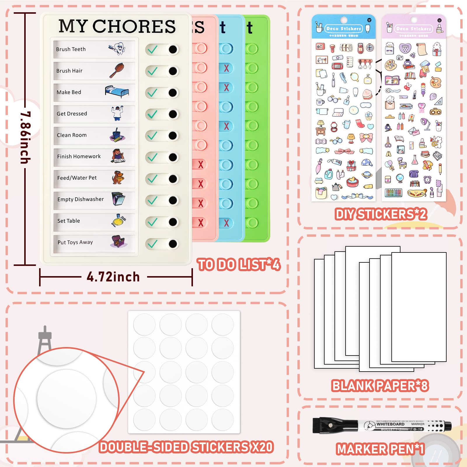- Package Includes: Package includes 4 chore chart for multiple Kids, 2 DIY stickers, 20 double-sided adhesive tapes, 8 white cardboard, and one marker. The kids chore chart is designed to help you well organize daily activities and household chores
