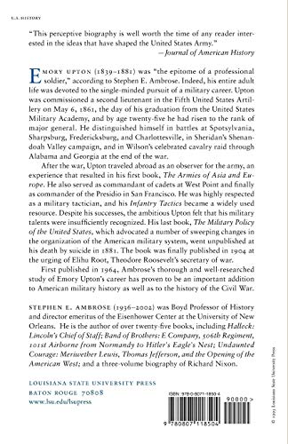 Emory Upton (1839-1881) was “the epitome of a professional soldier,” according to Stephen E. Ambrose. Indeed, his entire adult life was devoted to the single-minded pursuit of a military career. Upton was commissioned a second lieutenant in the Fifth United States Artillery on May 6, 1861, the day of his graduation from the United States Military Academy, and by age twenty-five he had risen to the rank of major general. He distinguished himself in battles at Spotsylvania, Sharpsburg, Fredericksburg, and Charlottesville, in Sheridan’s Shenandoah Valley campaign, and in Wilson’s celebrated cavalry raid through Alabama and Georgia at the end of the war. After the war, Upton traveled abroad as an observer for the army, an experience that resulted in his first book, The Armies of Asia and Europe. He also served as commandant of cadets at West Point and finally as commander of the Presidio in San Francisco. He was highly respected as a military tactician, and his Infantry Tactics became a widely used resource. Despite his successes, the ambitious Upton felt that his military talents were insufficiently recognized. His last book, The Military Policy of the United States, which advocated a number of sweeping changes in the organization of the American military system, went unpublished at his death by suicide in 1881. The book was finally published in 1904 at the urging of Elihu Root, Theodore Roosevelt’s secretary of war. First published in 1964, Ambrose’s thorough and well-researched study of Emory Upton’s career has proven to be an important addition to American military history as well as to the history of the Civil War.