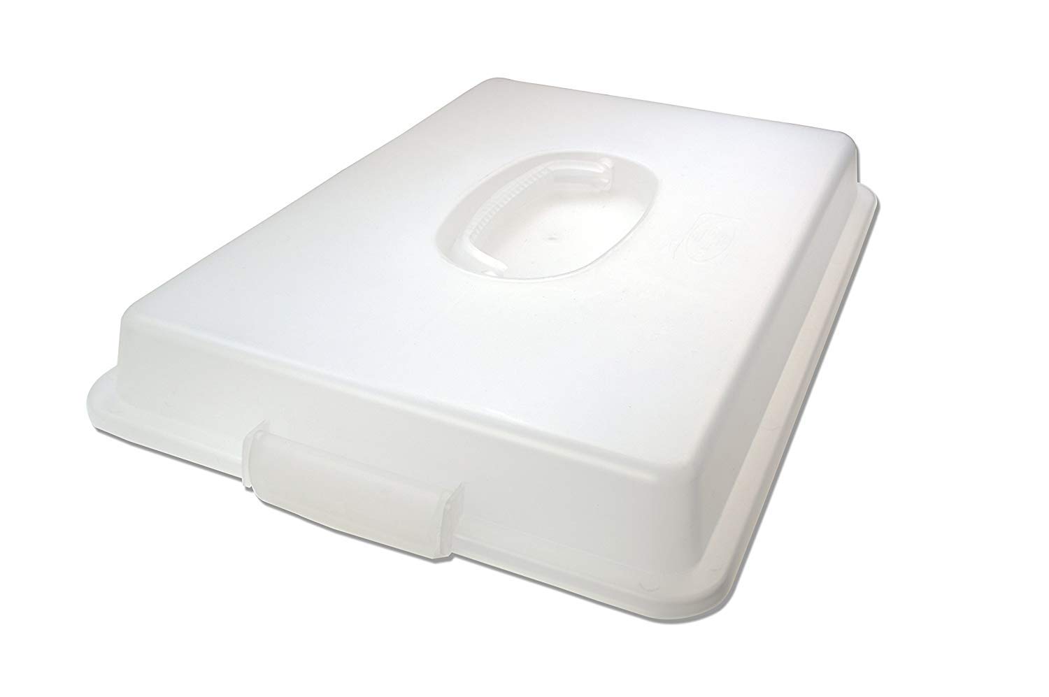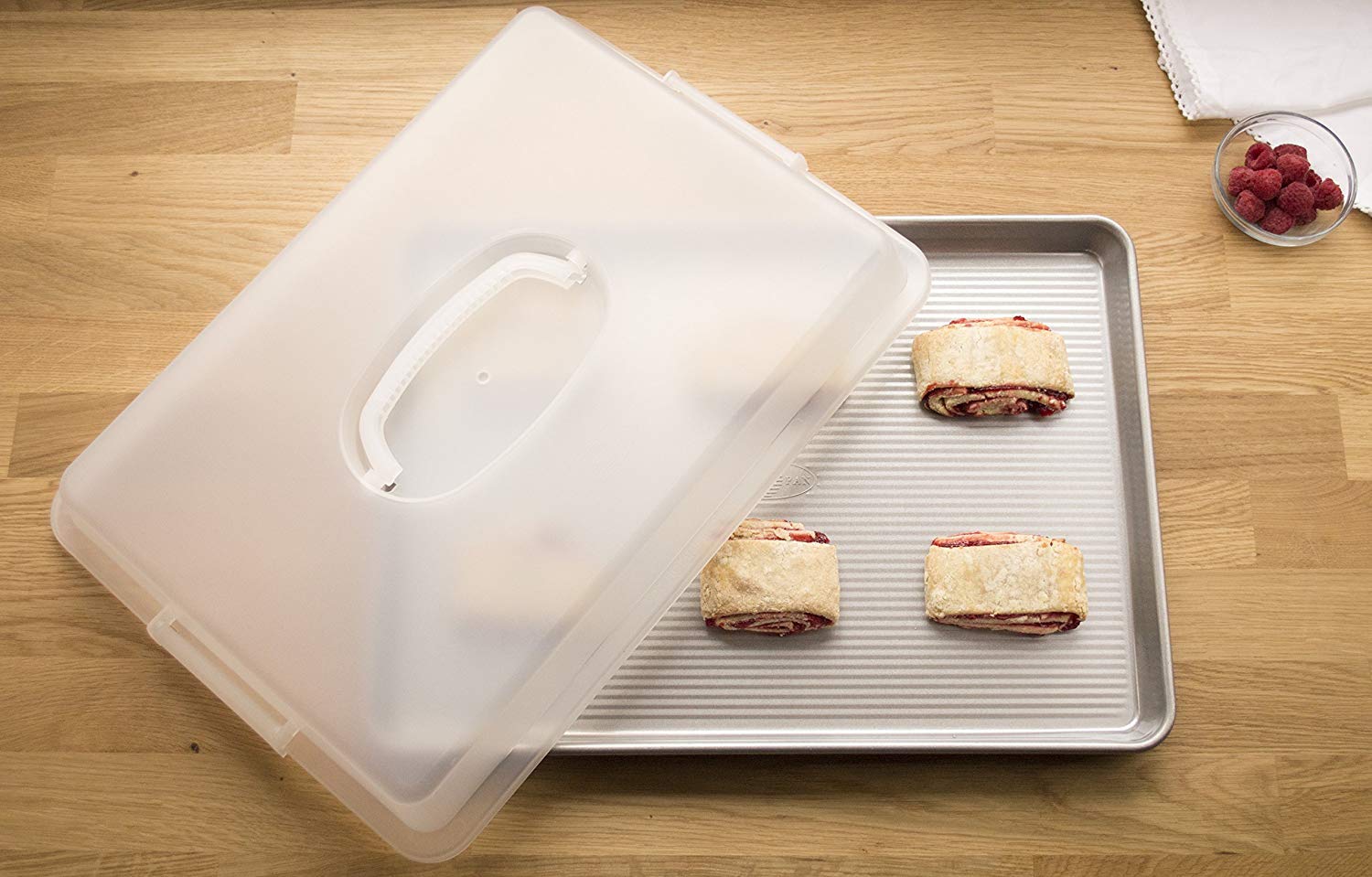 - Lid with handle specifically designed to fit USA Pan half sheet cake pan; makes for easy transport and protection of baked goods; do not use lid until pan has cooled to room temperature