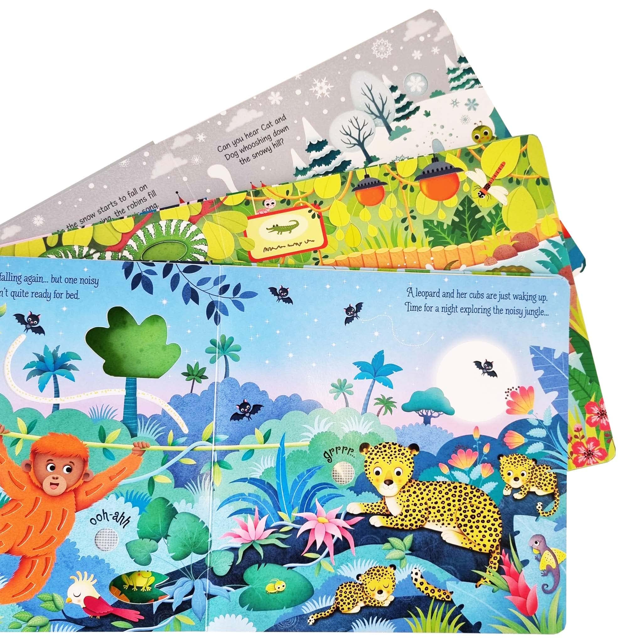 This collection of sound books supports early childhood development by engaging auditory and tactile senses to teach about animals and environments.