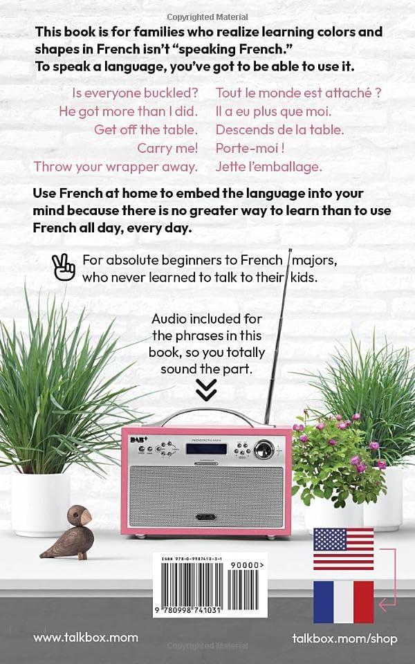 Yes! This is the phrasebook that allows families to start talking in French at home the same day they start! It’s for families who realize learning colors and shapes in French isn’t “speaking French.” To speak a language, you’ve got to be able to use it.This super cute book is laid out for you to find phrases you USE ALL THE TIME, WANT TO USE, and NEED TO USE. By starting with high-frequency sentences in your home, you’ll be able to talk and understand each other faster and more naturally. After all, you learned your first language by being talked to as a baby–not by going to baby grammar school.With this book, every time you get in the car, you can be speaking French: Buckle your seatbelt. Attache ta ceinture (de securite).Every time your baby wants to be carried, s/he can be speaking French: Porte-moi !And every time your children think you’re a trash can, you can say: Throw your wrapper away. Jette l’emballage.With over 1700+ phrases, there are phrases for all ages. Plus, the book includes a digital download of the audio (by a native speaker!), so you can totally sound the part. All translations and audio are by native speakers to help you sound like you’re from their country–not like you stepped out of a language class and are the awkward foreigner. This book is for beginners to French majors who never learned to talk to their family. We are so excited for you to talk in your home in French!!!Learn French French Phrasebook French for Kids French for Families French Audio