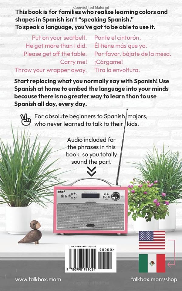 Yes! This is the phrasebook that allows families to start talking in Spanish at home the same day they start! It’s for families who realize learning colors and shapes in Spanish isn’t “speaking Spanish.” To speak a language, you’ve got to be able to use it. This super cute book is laid out for you to find phrases you USE ALL THE TIME, WANT TO USE, and NEED TO USE. By starting with high-frequency sentences in your home, you’ll be able to talk and understand each other faster and more naturally. After all, you learned your first language by being talked to as a baby–not by going to baby grammar school. With this book, every time you get in the car, you can be speaking Spanish: Put on your seatbelt. Ponte el cinturon. Every time your baby wants to be carried, s/he can be speaking Spanish: !Cargame! And every time your children hand you a wrapper, thinking you’re a trash can, you can say: Tira la envoltura. With over 1700+ phrases, there are phrases for all ages. Plus, the book includes access to the TalkBox.Mom companion app (iOS/Android) where you can listen to the native speaker audio, so you can totally sound the part. All translations and audio are by native speakers to help you sound like you’re from their country–not like you stepped out of a language class and are the awkward foreigner. This book is for beginners to Spanish majors who never learned to talk to their family. The Spanish in this book is for families wanting to speak with Spanish speakers in the Americas. It does lean towards Spanish spoken in Mexico. We are so excited for you to talk in your home in Spanish!!! Learn Spanish Spanish Phrasebook Spanish for Kids Spanish for Families Spanish Audio