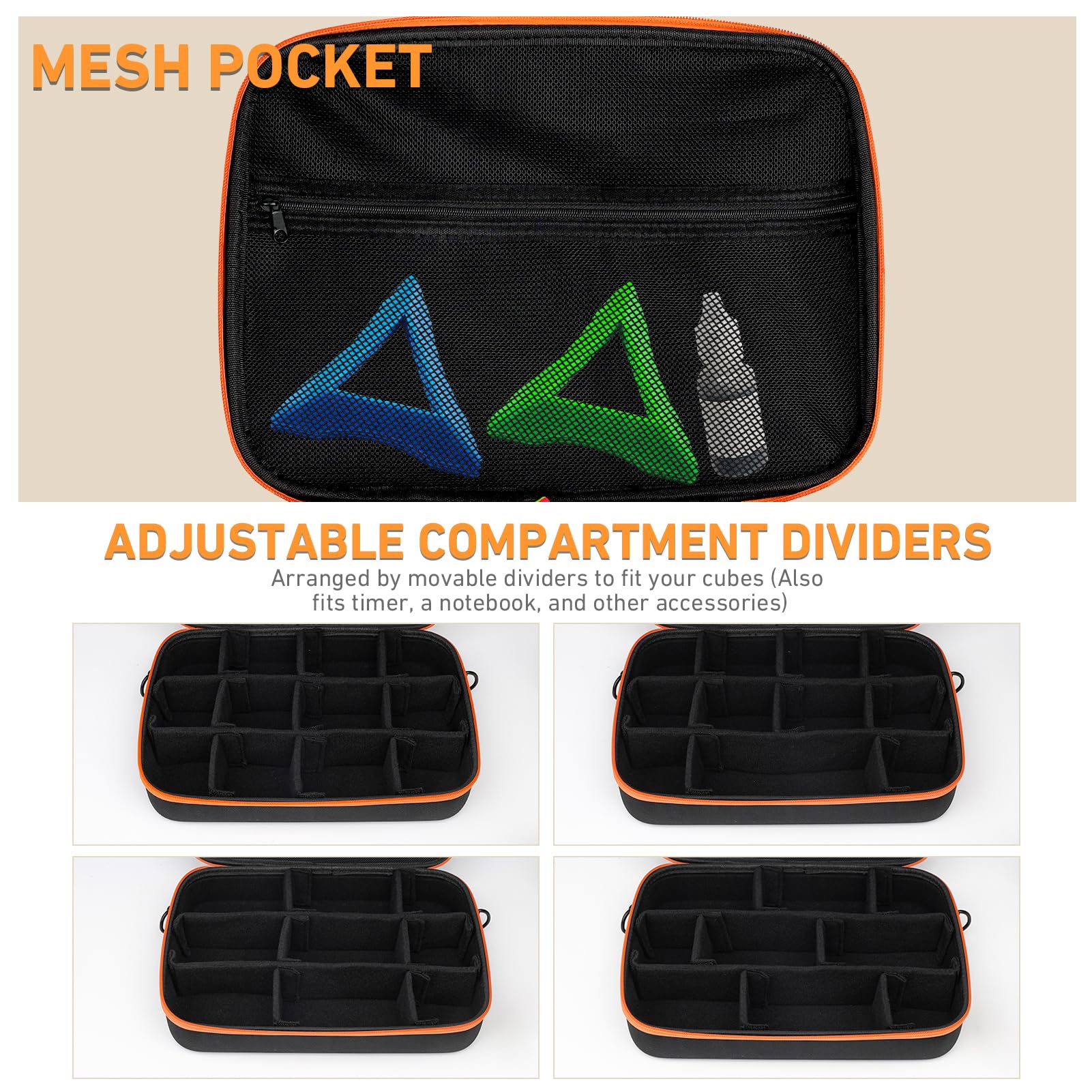 The cube case is divided into compartments with velcro, which you can adjust at any time depending on the size of the cube. Internal mesh pocket fit to store triangle brackets of multiple magic cube squares, small screwdrivers, tutorials and other accessories.