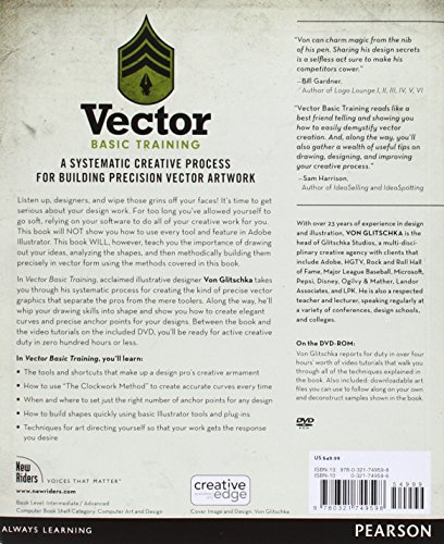 Listen up, designers, and wipe those grins off your faces! It’s time to get serious about your design work. For too long you’ve allowed yourself to go soft, relying on your software to do all of your creative work for you. This book will NOT show you how to use every tool and feature in Adobe Illustrator. This book WILL, however, teach you the importance of drawing out your ideas, analyzing the shapes, and then methodically building them precisely in vector form using the techniques explained in this book. In Vector Basic Training, acclaimed illustrative designer Von Glitschka takes you through his systematic process for creating the kind of precise vector graphics that separate the pros from the mere toolers. Along the way, he’ll whip your drawing skills into shape and show you how to create elegant curves and precise anchor points for your designs. Between the book and the video tutorials on the included DVD, you’ll be ready for active creative duty in zero hundred hours or less. In Vector Basic Training, you’ll learn: The tools and shortcuts that make up a design pro’s creative armament How to use “The Clockwork Method” to create accurate curves every time When and where to set just the right number of anchor points for any design How to build shapes quickly using basic Illustrator tools and plug-ins Techniques for art directing yourself so that your work gets the response you desire Why symmetry is your friend and how to use it effectively in your designs To get the most out of this book it is recommended that you have Adobe Illustrator CS4 or higher. On the DVD-ROM: Von Glitschka reports for duty in over four hours’ worth of video tutorials that walk you through all of the techniques explained in the book. Also included: downloadable art files you can use to follow along on your own and deconstruct samples shown in the book.