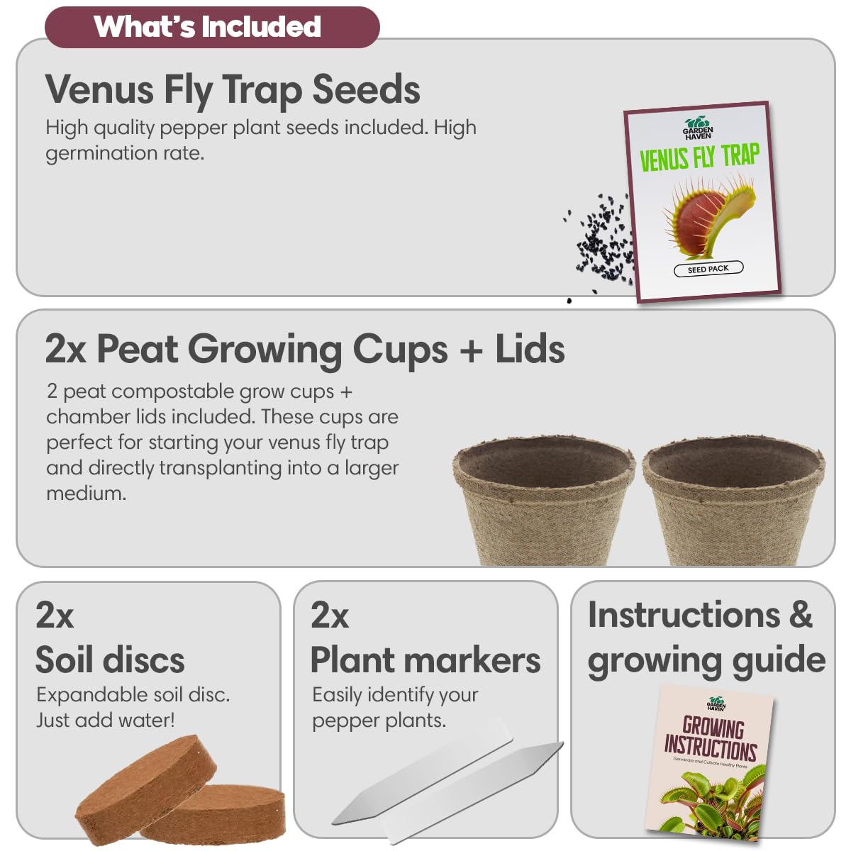 - Venus Flytrap Seed Growing Kit: The Venus Flytrap has been around for centuries and remains a favorite among carnivores and vegetarians alike. You will receive a perfect seed growing kit with 2 growing cups that are the perfect starter kit to start growing plants. Additionally, the kit includes soil that contains 0 additives so the Venus Flytraps can thrive.