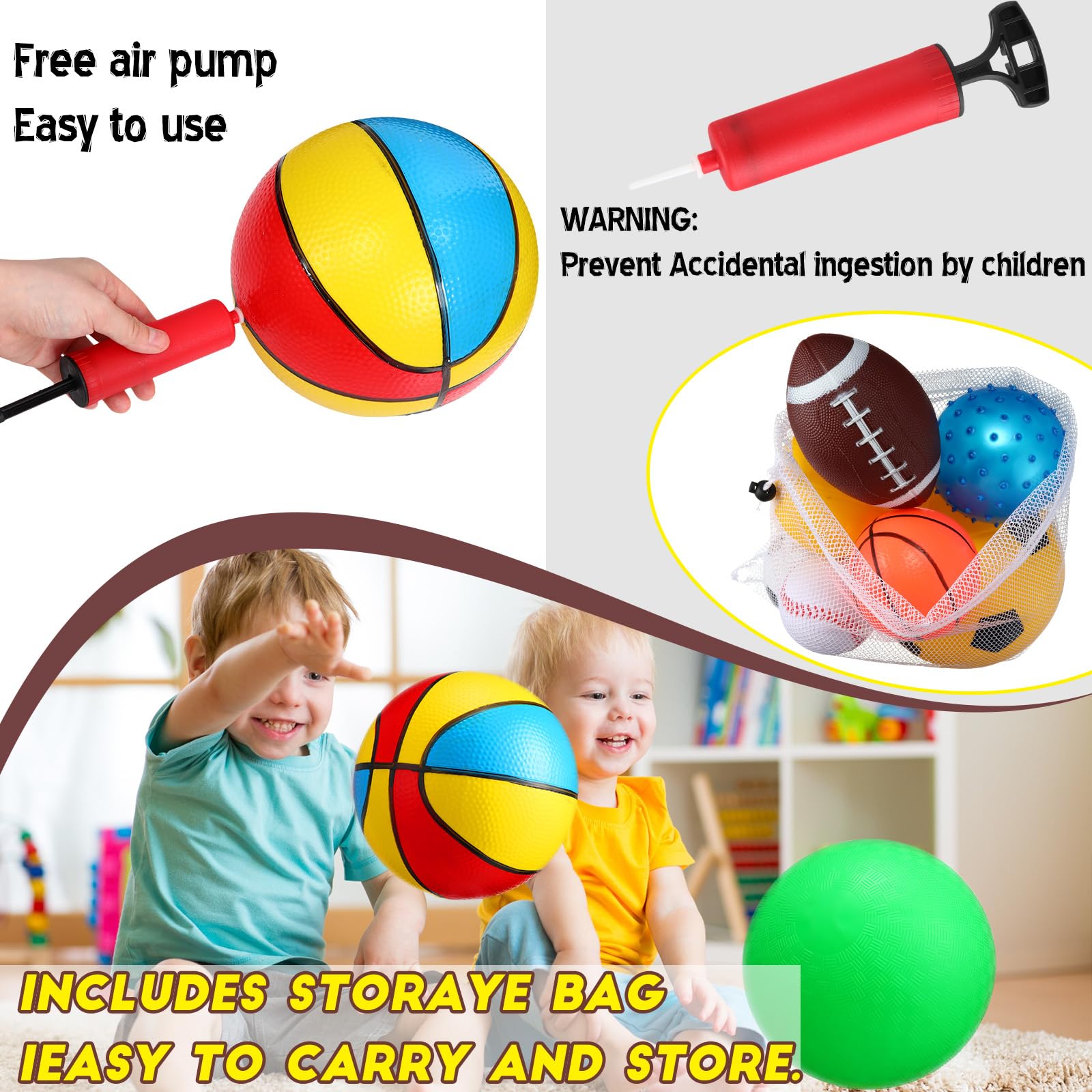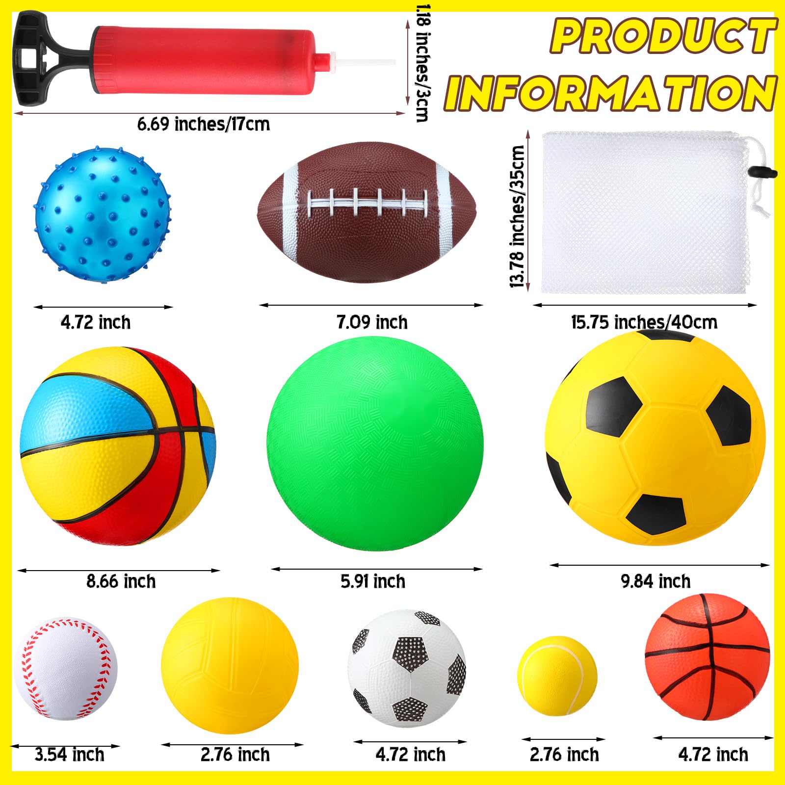 - Value 10 Pack Sports Ball Set: immerse your boys and girls into active play with our comprehensive 10 pack sports ball set that’s ideal for different ages; Get value with our set that includes 1 concave convex ball, 1 football, 1 basketball, 1 rugby ball, 1 volleyball, 1 three-color ball, 1 hand ball, 1 two-color football, a soft baseball, and 1grip ball; And we’ve thrown in a complimentary air pump and mesh bag