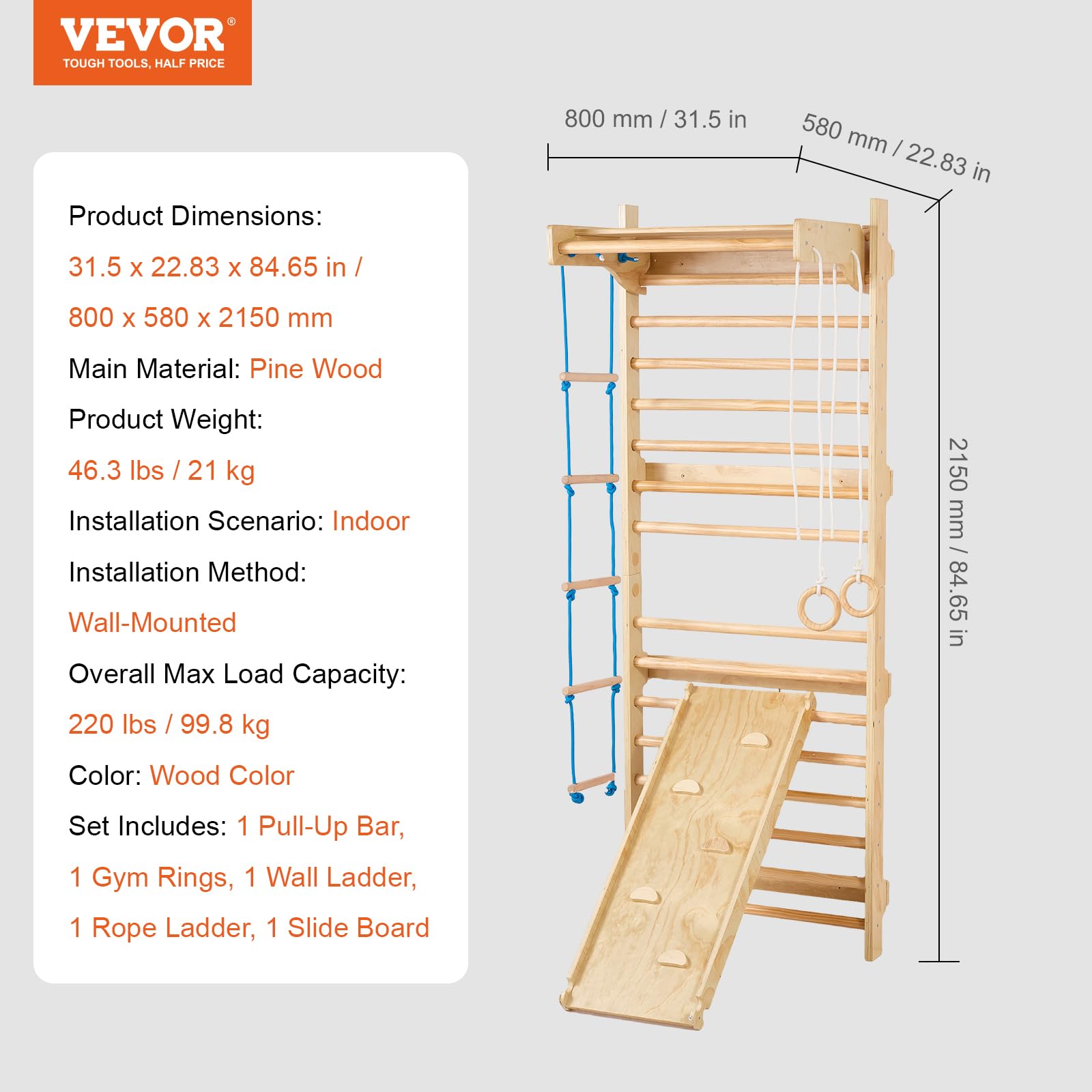 Be the first to review “VEVOR Swedish Wall Gym, 15-Level 5 in 1 Wooden Indoor Jungle Gym, 220 lbs Load Capacity Playground Climbing Toys With Pull-Up Bar, Gymnastic Rings, Wall Ladder, Rope Ladder, and Slide Board” Cancel reply