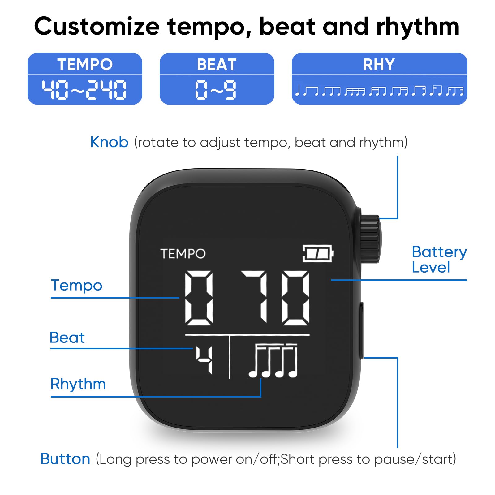 - [(Customize Rhythm, Beat and Tempo)] It is super easy to customize tempo, beat and rhythm by just rotating the dial (Tempo 40-240BPM, Beat 0-9, 9 different rhythms).