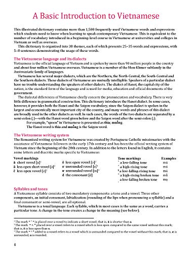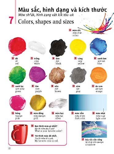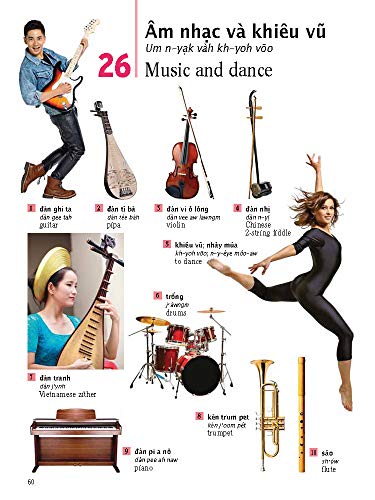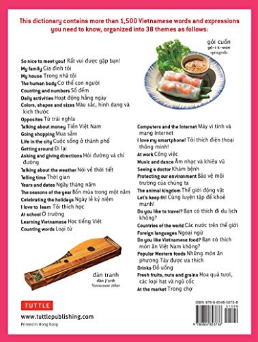 A fun and helpful resource for anyone interested in learning some Vietnamese–whether you’re 5 or 100! This picture dictionary covers the 1,500 most useful Vietnamese words and phrases. Each word and sentence is given using the Vietnamese alphabet–with a Romanized version to help you pronounce it correctly–along with the English meaning. The words are grouped into 40 different themes or topics, including basics, like meeting someone new and using public transportation, to culture-specific topics, like celebrating Vietnamese holidays and eating Vietnamese food. This colorful picture dictionary includes: Over 750 color photographs 1,500 culture-specific Vietnamese words and phrases 38 different topics–from social media and counting to Vietnamese food and holidays Example sentences showing how the words are used Free online audio recordings by native Vietnamese speakers of all the vocabulary and sentences to download or stream An introduction to Vietnamese pronunciation and grammar A bidirectional index to allow you to quickly look up words Vietnamese Picture Dictionary makes language learning more fun than traditional phrasebooks. This resource is perfect for beginners of all ages–curious kids, visual learners and future travelers to Vietnam.
