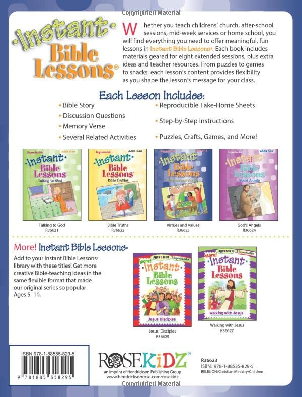 Fully-Illustrated, Reproducible Bible Lessons for Kids–Include everything you need to offer meaningful, fun Bible lessons on prayer. Geared for ages 5-10, each volume includes materials for eight extended sessions and dozens of Bible activities, puzzles, skits, snack ideas, and more. Whether you teach children’s church, after-school sessions, mid-week services, Sunday School, or home school, you will find everything you need to offer meaningful, fun lessons in Instant Bible Lessons. Each book includes materials geared for eight extended sessions, plus extra ideas and teacher resources. From puzzles to games to snacks, each lesson’s content provides flexibility as you shape the lesson’s message for your class. In Virtues and Values, your students will be encouraged to live so their lives will shine like precious jewels, as described in the Bible. Covers key values, including cooperation, compassion, submission, determination, appreciation, adoration, and more! Each Kids Bible Lesson Includes: Bible Story Discussion Questions Memory Verse Several Related Activities Reproducible Take-Home Sheets Step-By-Step Instructions for Teachers Puzzles, Crafts, Skit Ideas, Finger Play, Games and More! Experience the Convenience of Flexible Bible Lessons for Kids! The most exciting aspect of the Instant Bible lesson series is its flexibility. You can easily adapt these kids Bible lesson to a Sunday School hour, a children’s church service/Kids Ministry, a Wednesday night children’s Bible study, or home use. Packed with a variety of reproducible ideas, you will enjoy creating a class session that is best for your group of students–whether large or small, beginning or advanced, active or quiet. Here’s just some of the Bible activities included: Fun Crafts (Simple and Budget-Friendly) Role-Playing and Skit Ideas to get your kids moving Activities to help kids dig deeper Puzzles Action verses and songs Finger play and games Themed Snack Suggestions Extra Resources for Kids Sunday School Teachers These all-inclusive Bible lesson include helpful resources that make teaching easier than ever. Includes: Step-by-Step Teaching Instruction Teacher Helps (Practical advice and tips) Bulletin Board Ideas to create a fun atmosphere and safe environment Discussion Starters Perforated Pages to make it easy to copy handout and craft templates 5 Key Features of Rainbow’s Reproducible Bible Lessons: 1. Age-appropriate and Easy-to-understand Enjoy having solid, Bible-based material that explains key information in a way that is easy-to-understand for your kid’s age-group. Features memorable rhyming songs, Bible activities, and craft ideas that are age-appropriate. Covers every age group from nursery to preteens. 2. Packed with Fun Bible Activities for Kids! Loaded with original Bible activities, fun crafts, skit ideas, music options, snack suggestions, challenging puzzles, and more! Easily keep kids’ attention and unleash their creativity with these fun activities! Perfect for all attention spans and learning styles! 3. Flexible Bible Lessons and Ready-to-Use Bible Activities Bible verses and stories kick off each lesson followed by activities that help kids remember key information. Each lesson is all-inclusive and includes step-by-step instructions for teachers. Provides multiple activity options which make it easy to tailor your lesson to the needs, learning, styles, and preferences of your class. 4. Low-Prep Time and Budget-Friendly Includes ready-made hand-outs and includes templates for art and crafts. Most lessons use materials you can find around your house–helping you stick to your budget! 5. Reproducible (Features Perforated Pages) Save time and money with these ready-to-use Bible lessons and activities. These reproducible books use perforated pages making it easy to make copies for your class (or kids).
