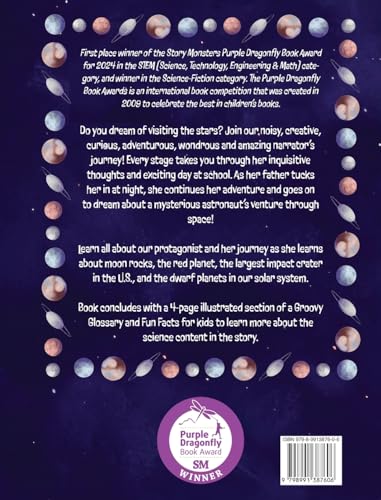 First place winner of the Story Monsters Purple Dragonfly Book Award for 2024 in the STEM (Science, Technology, Engineering & Math) category, and winner in the Science-Fiction category. The Purple Dragonfly Book Awards is an international book competition that was created in 2009 to celebrate the best in children’s books. Do you dream of visiting the stars? Join our noisy, creative, curious, adventurous, wondrous and amazing narrator’s journey! Every stage takes you through her inquisitive thoughts and exciting day at school. As her father tucks her in at night, she continues her adventure and goes on to dream about a mysterious astronaut’s venture through space! Learn all about our protagonist and her journey through space while she learns about moon rocks, the red planet, the largest impact crater in the U.S., and the dwarf planets in our solar system. The book concludes with a 4-page illustrated Groovy Glossary and Fun Facts section on the science in the story, plus a 2-page Comet Crossword and Planetary Puzzle activity.