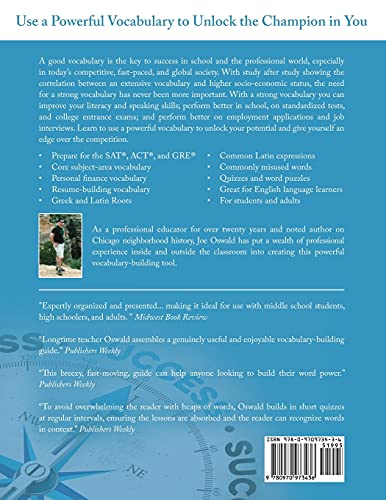 Perfect for in-school or home-schooled students and English language learners, Midwest Book Review states, “Expertly organized and presented, Vocabulary for Champions is ideal for use with middle school students, high schoolers, and adults.” According to Publishers Weekly…”Longtime teacher Oswald assembles a genuinely useful and enjoyable vocabulary-building guide…Teens and adults at all stages of life can benefit from this well-constructed workbook…This breezy, fast-moving guide can help anyone looking to build their word power.” With core subject-area vocabulary and multi-level reading vocabulary, this book is great for general vocabulary-building as well as preparing for school-based exams and standardized tests such as the SAT,(r) ACT,(r) and GRE.(r) In addition, this book contains economics and personal finance vocabulary; resume-building vocabulary; words related to science, business, government, society, economics, politics, history, world affairs, and world religions; Greek and Latin Roots; common Latin expressions; and commonly misused words. Written by a teacher with over twenty years of experience in teaching history, reading, writing, consumer education, and standardized test prep, this book contains over 2,000 words and activities to help students, adults, and English language learners master important vocabulary. Complete with dozens of quizzes and word puzzles to practice the meaning and spelling of words. With study after study showing the correlation between an extensive vocabulary and higher socio-economic status, a powerful vocabulary is the key to success in school and the professional world.