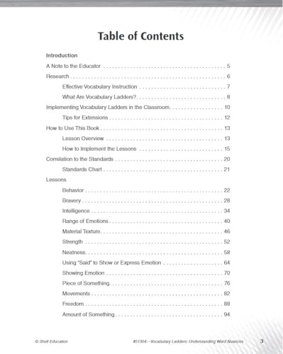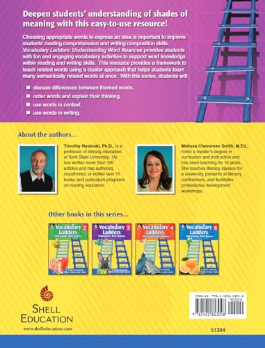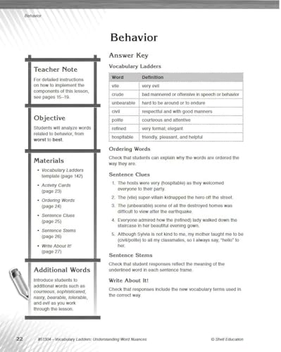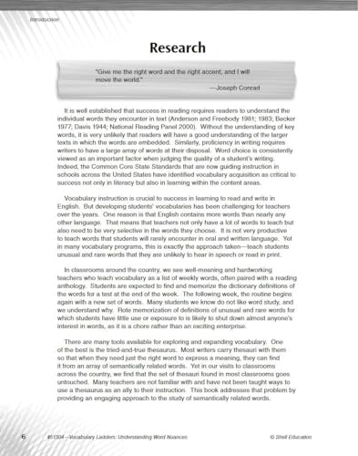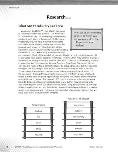 Choosing appropriate words to express an idea is important to improve students’ reading comprehension and writing composition skills. Vocabulary Ladders: Understanding Words Nuances provides fifth grade students with fun and engaging vocabulary activities to support word knowledge within reading and writing skills. This resource provides a framework to teach related words using a cluster approach that helps students learn many semantically related words at once. With this series, students will discuss differences between themed words, order words and explain their thinking, use words in context, and use words in writing.