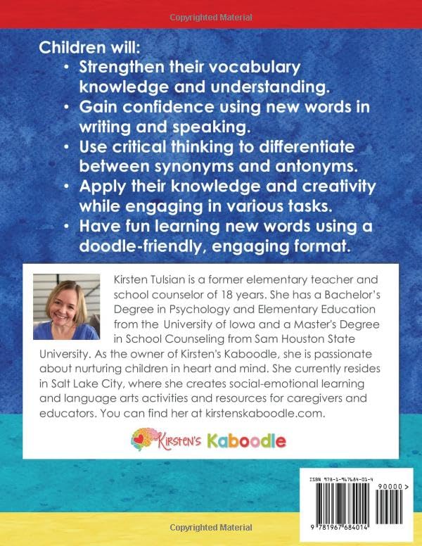 Learning new vocabulary does NOT have to be tedious or boring! This vocabulary-building workbook contains 180 words, their parts of speech, definitions, sample sentences, synonyms, antonyms, and related activities. If used each weekday, this workbook will take 36 weeks to complete, covering a typical school year of 180 days. Your child(ren) will: Strengthen their vocabulary use and knowledge. Gain confidence using new words in speaking and writing. Use critical thinking to differentiate between synonyms and antonyms. Apply their knowledge and creativity while engaging in various tasks. Have fun learning new words using a doodle-friendly, engaging format. Research indicates a strong correlation between vocabulary knowledge and reading comprehension. Vocabulary development is crucial for language and speaking skills and is one of the most reliable predictors of academic success. These doodle-friendly, noteworthy vocabulary pages are perfect for 4th, 5th, and 6th-grade kids (approximately 9-12 years old). This workbook can be used as a vocabulary refresher during the summer, for homeschooling families, or anyone learning English.