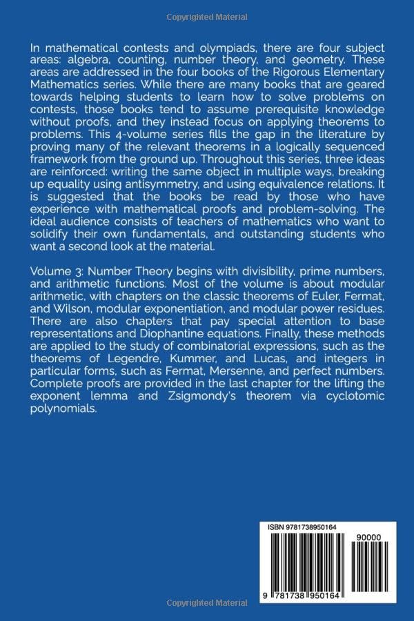 In mathematical contests and olympiads, there are four subject areas: algebra, counting, number theory, and geometry. These areas are addressed in the four books of the Rigorous Elementary Mathematics series. While there are many books that are geared towards helping students to learn how to solve problems on contests, those books tend to assume prerequisite knowledge without proofs, and they instead focus on applying theorems to problems. This 4-volume series fills the gap in the literature by proving many of the relevant theorems in a logically sequenced framework from the ground up. Throughout this series, three ideas are reinforced: writing the same object in multiple ways, breaking up equality using antisymmetry, and using equivalence relations. It is suggested that the books be read by those who have experience with mathematical proofs and problem-solving. The ideal audience consists of teachers of mathematics who want to solidify their own fundamentals, and outstanding students who want a second look at the material. Volume 3: Number Theory begins with divisibility, prime numbers, and arithmetic functions. Most of the volume is about modular arithmetic, with chapters on the classic theorems of Euler, Fermat, and Wilson, modular exponentiation, and modular power residues. There are also chapters that pay special attention to base representations and Diophantine equations. Finally, these methods are applied to the study of combinatorial expressions, such as the theorems of Legendre, Kummer, and Lucas, and integers in particular forms, such as Fermat, Mersenne, and perfect numbers. Complete proofs are provided in the last chapter for the lifting the exponent lemma and Zsigmondy’s theorem via cyclotomic polynomials.