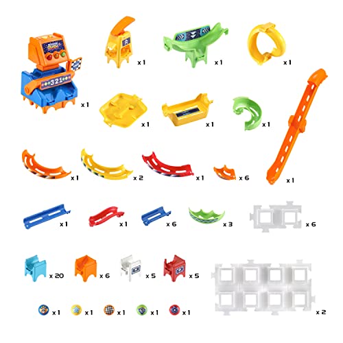- Includes five marbles and 73 building pieces featuring a musical starting gate, fast tracks, peg maze, launcher and more that easily connect