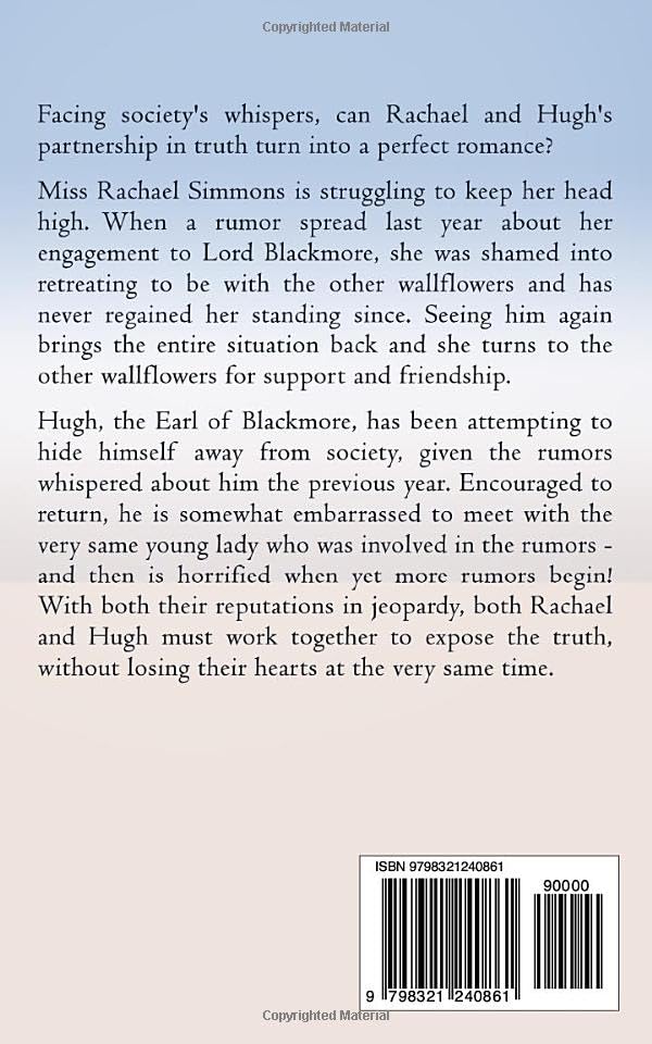 Facing society’s whispers, can Rachael and Hugh’s partnership in truth turn into a perfect romance? Miss Rachael Simmons is struggling to keep her head high. When a rumor spread last year about her engagement to Lord Blackmore, she was shamed into retreating to be with the other wallflowers and has never regained her standing since. Seeing him again brings the entire situation back and she turns to the other wallflowers for support and friendship. Hugh, the Earl of Blackmore, has been attempting to hide himself away from society, given the rumors whispered about him the previous year. Encouraged to return, he is somewhat embarrassed to meet with the very same young lady who was involved in the rumors – and then is horrified when yet more rumors begin! With both their reputations in jeopardy, both Rachael and Hugh must work together to expose the truth, without losing their hearts at the very same time. Wallflower Whispers is the third story in the Waltzing with Wallflowers series. It is clean, wholesome, and suitable for all ages. Get your copy today!