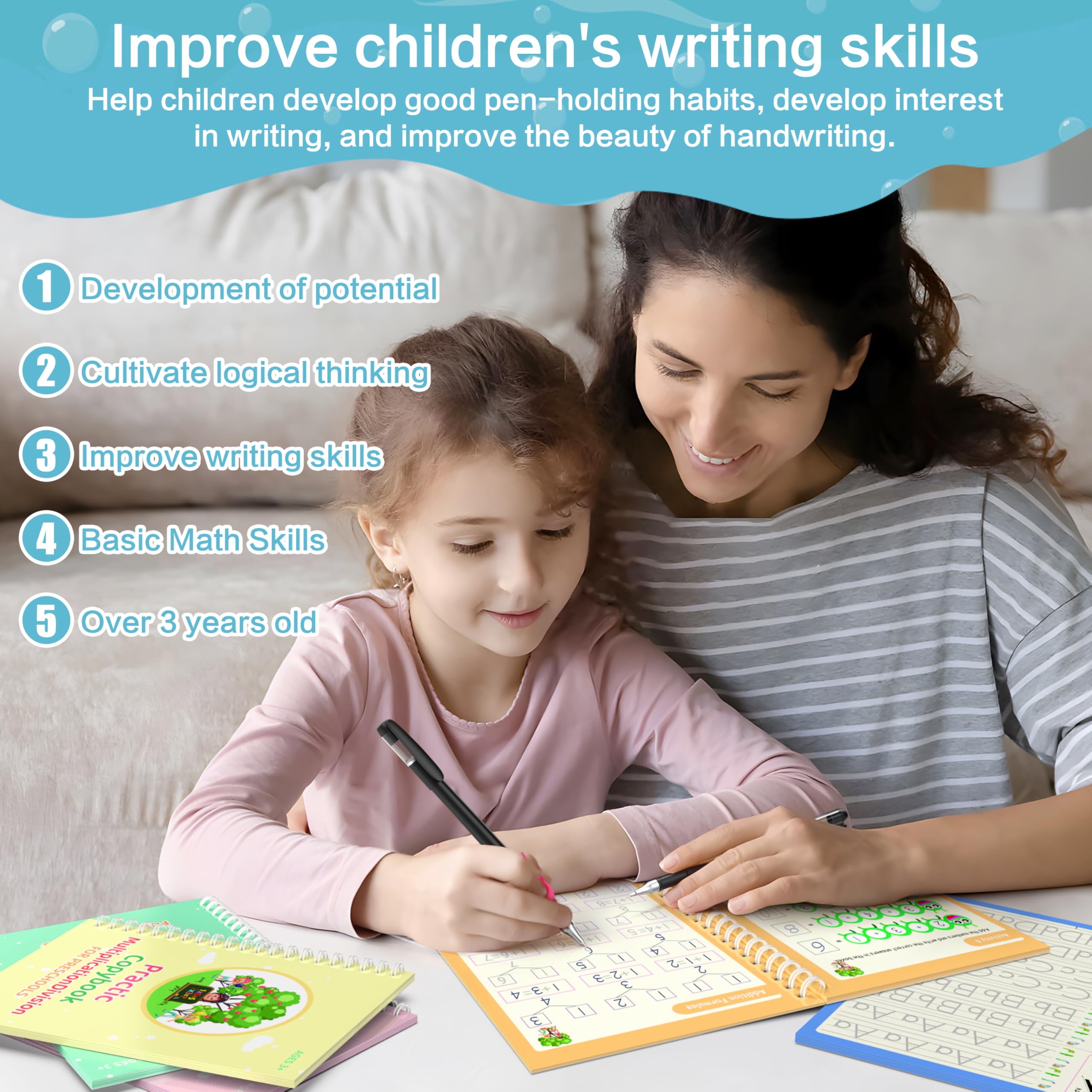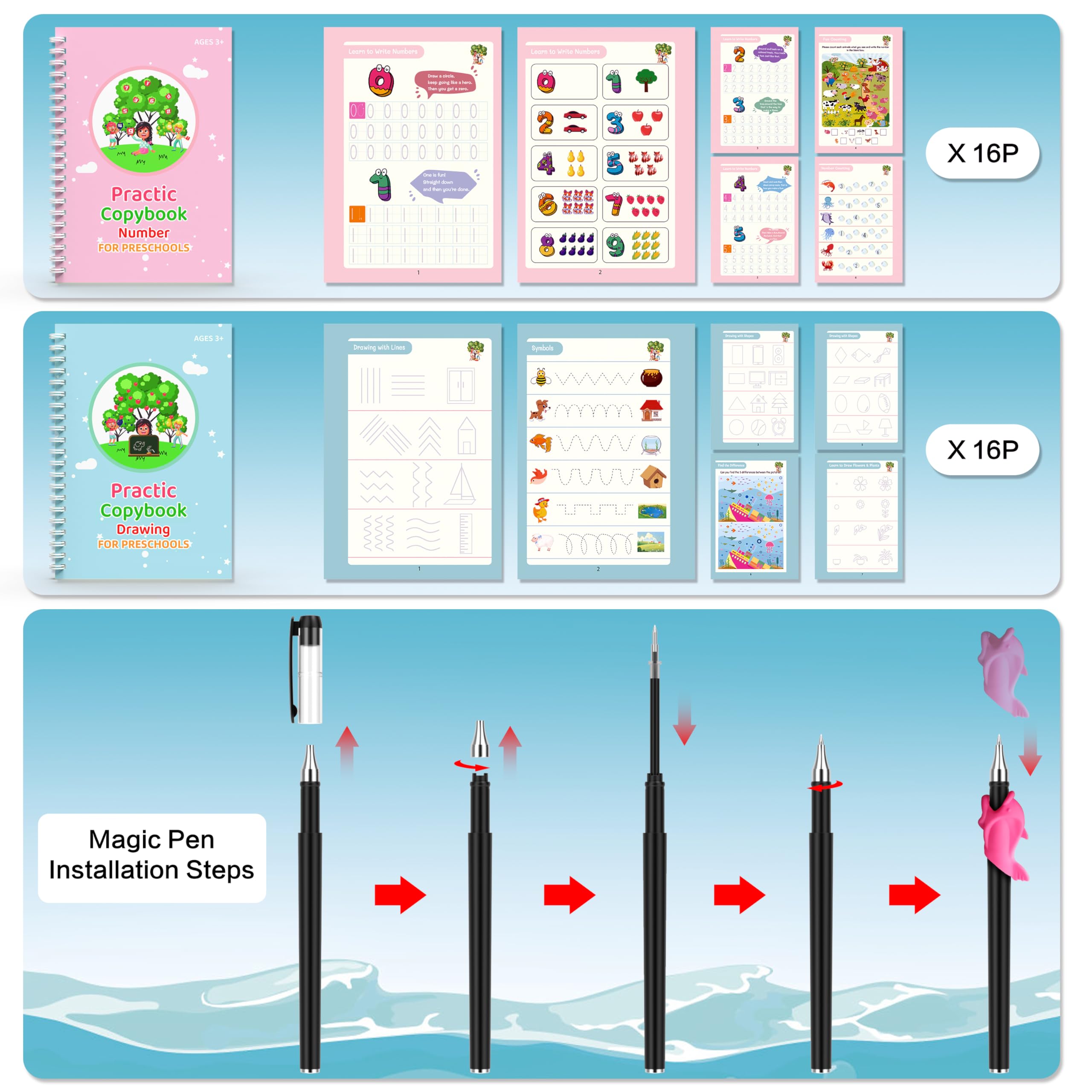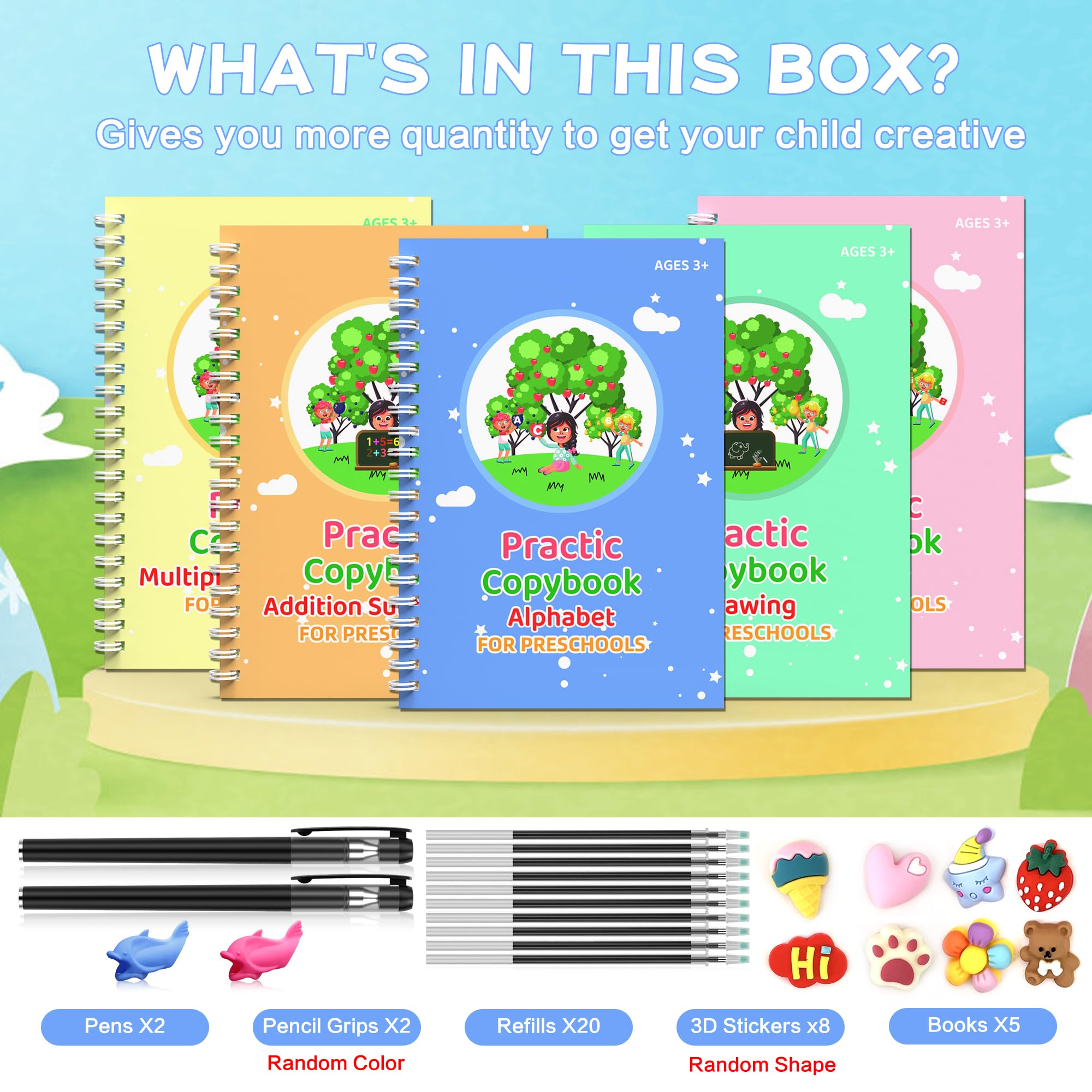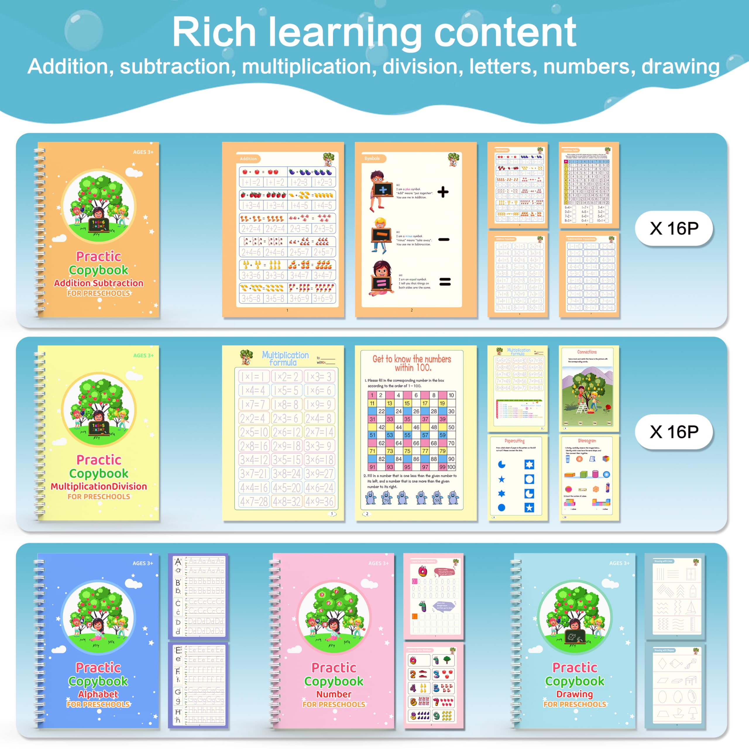 - Magic grooved writing practice books:The package includes 5 magic practice copybooks for Kids (Addition,Multiplication,Numbers , Alphabet, Drawing) Compared with the other 4 sets on the market, this set has one more book, as well as 2 pens, 2 pencil grips, 20 replacement refills, and 2 packs of water cup/refrigerator 3D stickers, The grooves are deeper and more numerous.
