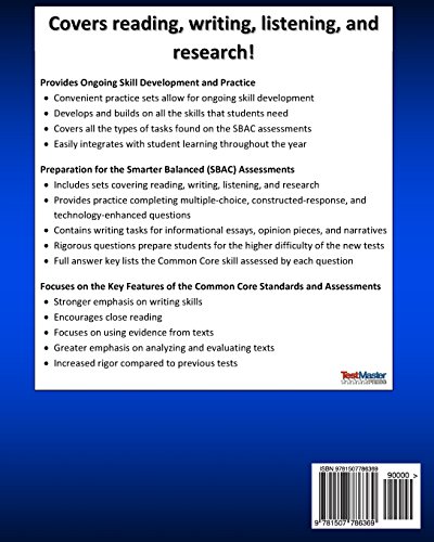 This practice book will prepare students for the Smarter Balanced (SBAC) English Language Arts/Literacy assessments. It will develop all the skills that students need and provide ongoing practice with the types of questions and tasks found on the real assessments. Just like the real SBAC assessments, it includes tasks covering reading, writing, listening, and research. Provides Ongoing Skill Development and Practice – Convenient practice sets allow for ongoing skill development – Includes sets covering literary texts, informational texts, sets with writing tasks, listening sets, and sets with research tasks – Division into sets allows the book to be used to prepare for the Interim Assessment Blocks (IABs) as well as the complete summative assessments – Format allows for review after each set to provide feedback and promote improvement Developed Specifically to Match the Smarter Balanced (SBAC) Assessments – Covers all the Common Core skills assessed on the real SBAC assessments – Includes sets covering reading, writing, listening, and research – Provides practice completing multiple-choice, constructed-response, and technology-enhanced questions – Contains writing tasks for informational essays, opinion pieces, and narratives – More rigorous questions prepare students for the higher difficulty of the new assessments – Strong focus on key Common Core features including close reading, using evidence from text, and analyzing and evaluating texts – Full answer key lists the Common Core skill assessed by each question Key Benefits of this Book – Builds confidence by helping students prepare before taking the real tests – Develops all the English Language Arts skills that students need – Provides experience answering all types of questions and completing all types of tasks – Reduces test anxiety by allowing low-stress practice – More rigorous tasks encourage deeper understanding and more advanced thinking – Detailed answer key allows for student work to be reviewed and improved on