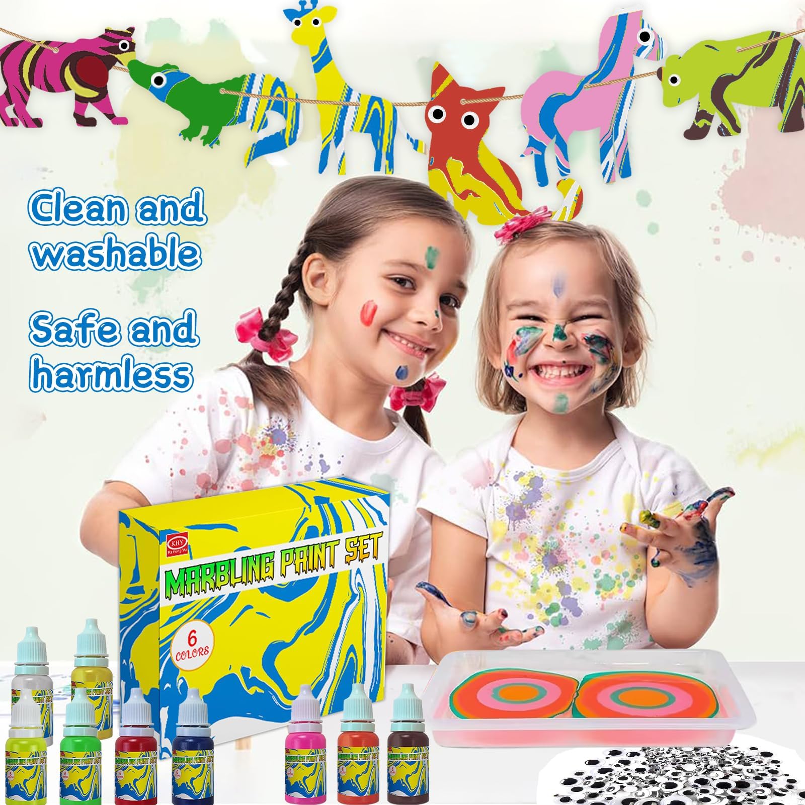 - Package includes: This water marbling paint kit contaions 10 paint colors, 10 art sheets, 1 design tray, 8 carrageenan powder, 2 pipette, 5 clips, 1 trowel, 2 paintbrush, art comb, 5 drawling needles, 1 rope, It also comes with 12 animal wood chips and 56 eye patches of mixed sizes, allows kids endless creative opportunities