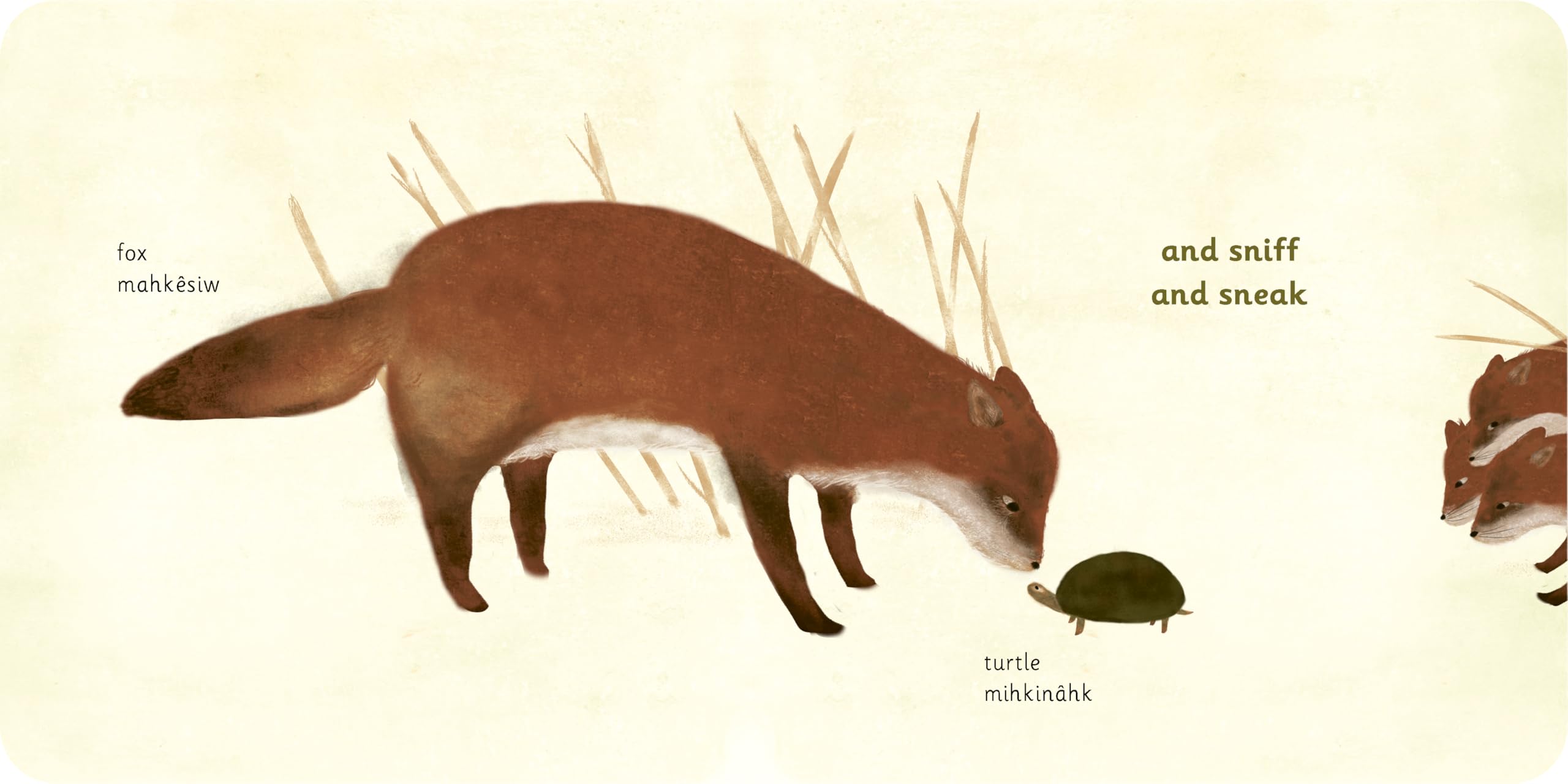 This book introduces young children to nature, animals, and a new language through engaging illustrations and a glossary of Cree words.