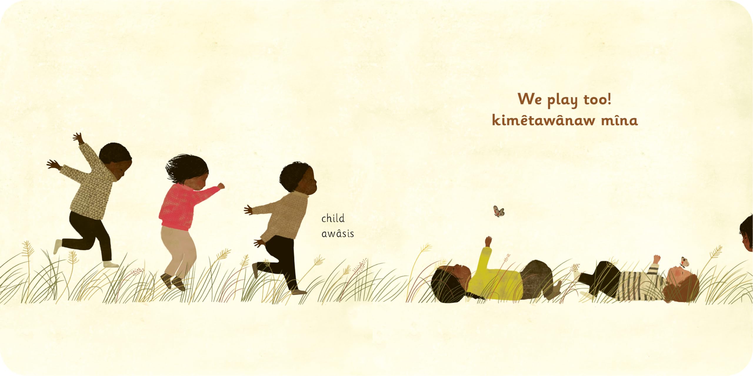 A BEST CHILDREN’S BOOK OF THE YEAR: New York Times, Washington Post, New York Public Library, Kirkus Reviews, Globe and Mail, Horn Book, and Boston Globe STARRED Reviews in Kirkus, Publisher’s Weekly, The Horn Book, School Library Journal A 2022 Best Book for Babies From Julie Flett, the beloved author and illustrator of Birdsong, comes a joyous new book about playtime for babies, toddlers, and kids up to age 7. Animals and kids love to play! This wonderful book celebrates playtime and the connection between children and the natural world. Beautiful illustrations show: birds who chase and chirp! bears who wiggle and wobble! whales who swim and squirt! owls who peek and peep! and a diverse group of kids who love to do the same, shouting: We play too! / kimetawanaw mina At the end of the book, animals and children gently fall asleep after a fun day of playing outside, making this book a great bedtime story. A beautiful ode to the animals and humans we share our world with, We All Play belongs on every bookshelf. This book also includes: A glossary of Cree words for wild animals in the book A pronunciation guide and link to audio pronunciation recordings