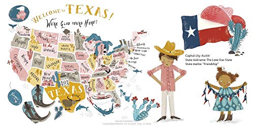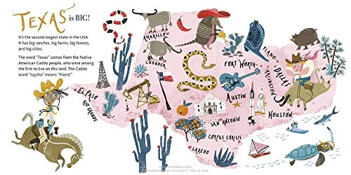 Welcome to Texas! Whether they’re locals or visitors, young readers will love this bright, cheerful, fact-filled picture book celebration of “The Lone Star State.” With information about the state’s animals, plants, regions, food, people, customs, and fun places to visit, this tribute to Texas is the perfect gift for vacationers and residents alike. The warm, bright illustrations highlight the many delights to be found throughout the state, and the easy-yet-informative details (“Texas is BIG! It’s the second-largest state in the USA”) give just the right amount of information to kids from preschool on up.