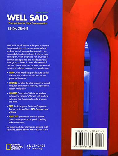 ISBN 9781305641365 is student textbook only. It will not come with access code for online WORKBOOK. Access code sold separately at other ISBN. Audio Files can be download from this title website. The Well Said series is designed to improve the pronunciation and communication skills of beginner to advanced students from all language backgrounds. It offers a clear course plan covering the essential areas of pronunciation, including stress, rhythm, and intonation–features that research shows help students the most. Additionally, there are over fifty pages of supplemental activities focusing on consonant and vowel sounds. This level of Well Said introduces the most important pronunciation features at an intermediate to advanced level. Website for teachers and students includes the full audio program.