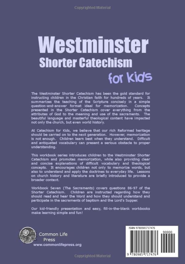 The seventh book in the Westminster Shorter Catechism for Kids series covers Questions 86-97. Children are instructed regarding the proper reading and hearing of the word, as well as participation in the sacraments of baptism and the Lord’s Supper.