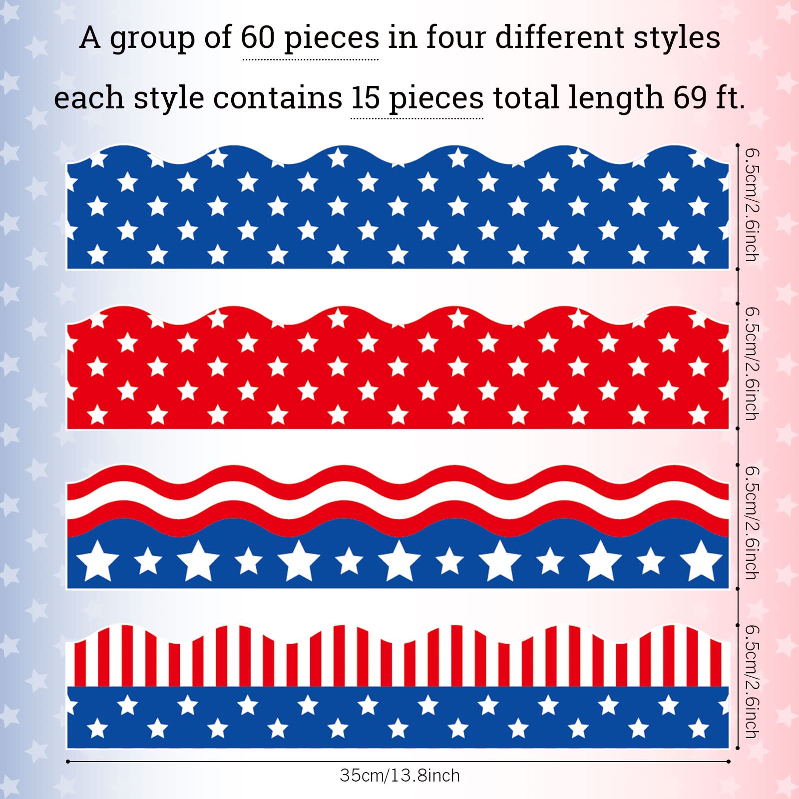 Whaline 69Ft 4th of July Bulletin Board Border 60 Sheet Red Blue White Stars Stripes Trim Border Stickers 4 Design Self-Adhesive American Flag Border Decals for Independence Day Classroom Decoration