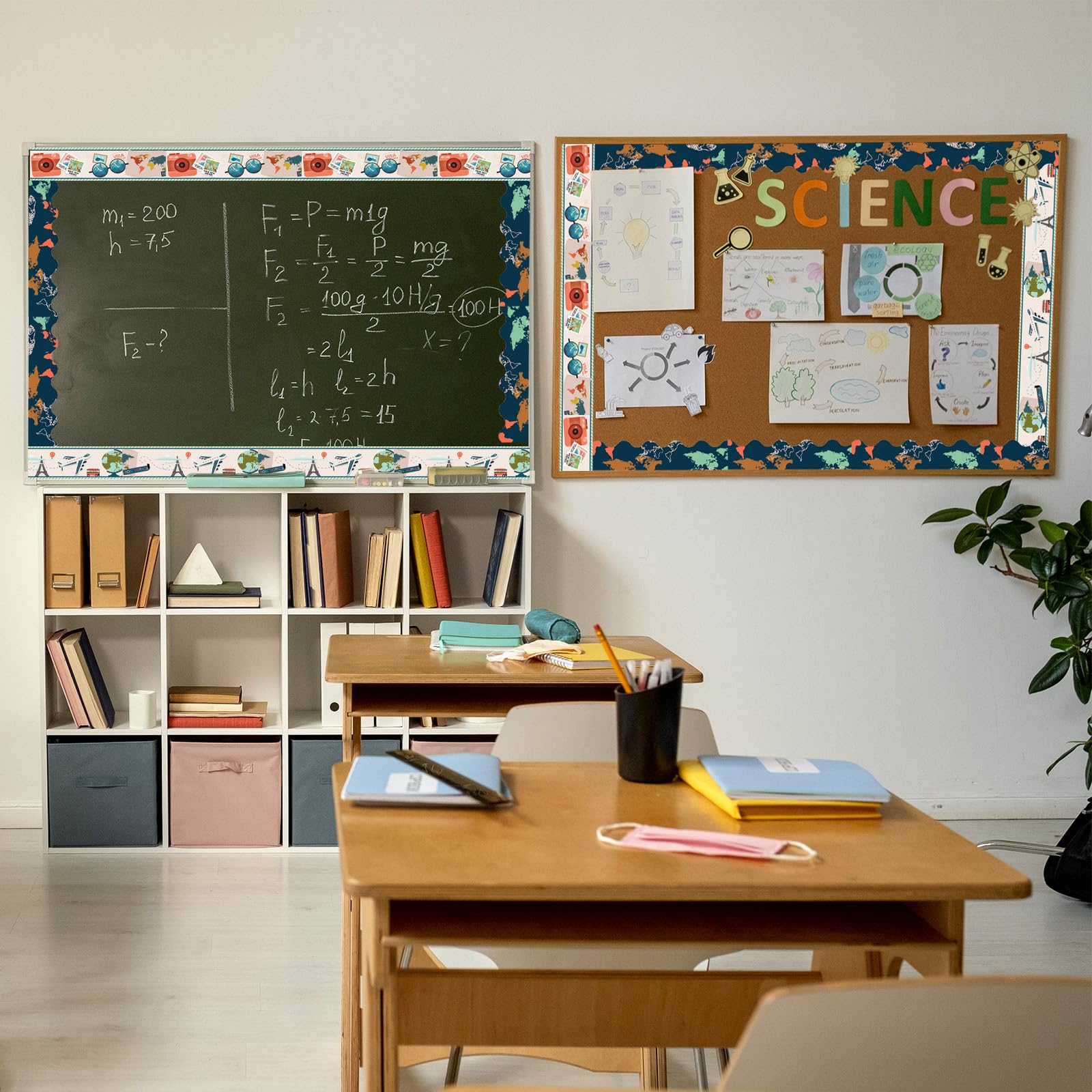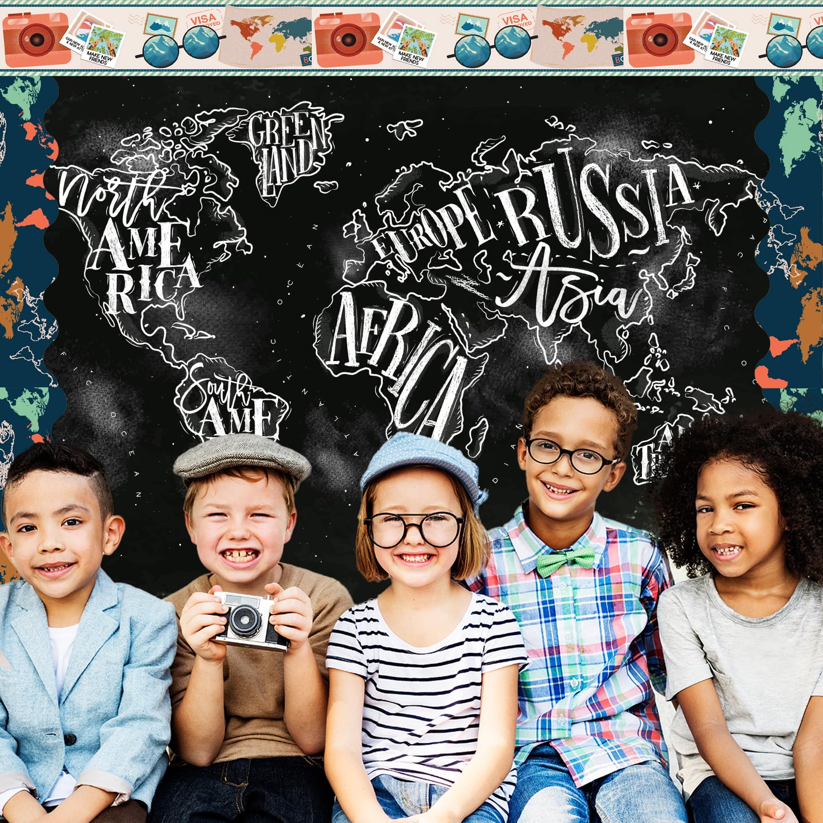 This world map border provides a decorative and educational visual aid for a classroom or homeschool environment.