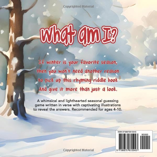 Fourteen whimsical, lighthearted but engaging rhyming riddles about winter with beautiful illustrations to reveal the answers. Older kids will puzzle their way through the riddles while younger children will delight in the pictures. Makes a fun interactive classroom read-aloud, an entertaining bedtime guessing game, or a great way to stump Grandpa! *Recommended for riddlers ages 4-8. From the book: Q. I dance in the air, falling softly to the ground. Like a crystal, I shimmer and land gently on the ground. What am I? A. A snowflake Q. I’m a drink that will warm you From your head to your toes. Chocolatey, delicious, With tiny marshmallows. What am I? A. Hot cocoa *Perfect holiday gift! *Wonderful addition to your themed seasonal book collection. Puzzles and riddles are a great way for children to use their deductive reasoning skills and improve their mental speed and short-term memory. And all the while, they’ll be having so much fun, they won’t even know they’re learning! Look for the full seasonal series with riddles for Halloween, Christmas, spring, summer, autumn, Valentine’s Day, and birthdays, and more coming in 2025! Collect them all! This book uses a slightly different illustration style than the first four books in the series.