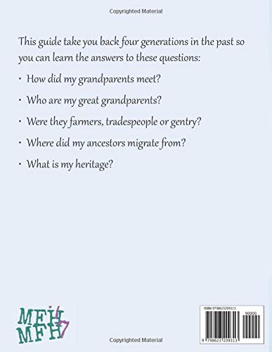 Want to learn about your heritage? Start here. Use this genealogy journal to record how you want to be remembered, stories about your parents, photos of your grandparents and memories of their parents and times gone by. Start by filling out the name of your direct ancestors on the family chart. Then, find pictures of each person, find their page and add the photograph. When there is no picture, ask if there are letters or other personal effects from that person. From there, find out when and where they were born and married. For any ancestors who have passed away, find out when and where they died and where they are buried. Consider a free search on Find-a-Grave and FamilySearch to fill in information that your family does not know. If you have met some of your ancestors you can write your own memories of them yet remember to talk to them too and let them tell you stories. You’ll be happy if you record memories of grandparents before they fade. And, they’ll have stories about their parents; your great grandparents. This will take you back four generations in the past! With four generations of information, you can learn the answers to: How did my grandparents meet? Who are my great grandparents? Were they farmers, tradespeople or gentry? Where did my ancestors migrate from? What is my heritage? This book is for beginner genealogists, grandparents creating a keepsake memory box for grandchildren and for the casual family historian and storyteller.