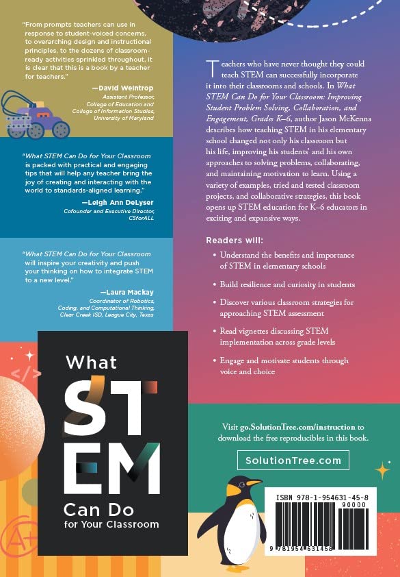 Author and educator Jason McKenna describes how teaching STEM education in his elementary school changed his classroom and his life, improving his students’ and his own approaches to problem solving, collaboration, and general motivation to learn. Offering examples, tried and tested classroom projects, and collaborative strategies, this innovative resource opens up STEM education in K-6 classrooms in exciting and expansive new ways. K-6 educators will: Understand the benefits and importance of STEM in elementary schools Build resiliency and curiosity in students Discover a variety of classroom instruction strategies to approach STEM assessment Read vignettes discussing STEM implementation across grade levels Use new strategies to engage and motivate student learning through voice and choice Contents: Part 1: Start STEM Early Chapter 1: Inspiring Students With STEM Narratives Chapter 2: Teaching STEM in Elementary School Part 2: Discover STEM Learning Principles Chapter 3: Focusing on Authentic Engagement, Choice, and Collaboration Chapter 4: Creating Risk Takers Part 3: Explore STEM Pedagogy Chapter 5: Exploring STEM Teaching and Guided Discovery Learning Chapter 6: Making Assessment Student Centered in Elementary STEM Classrooms Chapter 7: Exploring STEM and Creativity Chapter 8: Bringing It All Together Epilogue References and Resources Index