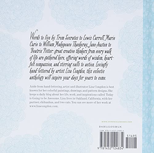 This collection of 100 quotes beautifully hand-lettered with accompanying artwork is a delightful reminder to get out there and make the most of life. A book of quotes like no other, Whatever You Are, Be a Good One is a thought-provoking collection that compiles the timeless wisdom of great original minds–from Marie Curie to Stephen King, Joan of Arc to Jack Kerouac, Oscar Wilde to Harriet Tubman–brilliantly hand-lettered by beloved indie artist Lisa Congdon. Readers will find enlightening insights (“Wisdom begins in wonder”–Socrates), stirring calls to action (“Leap and the net will appear”–John Burroughs), and stimulating encouragements (“Be curious, not judgmental”–Walt Whitman) beautifully illuminated on every page. INCREDIBLE TALENT: Lisa Congdon is an internationally acclaimed fine artist, illustrator, and writer who is best known for her hand-lettering, paintings, drawings, and pattern designs. INSPIRATIONAL BOOK: Featuring hand-lettered words and graphics on each page, this eclectic anthology of 100 motivational quotes (and some poems) makes an ideal gift to celebrate graduating high school or college, beginning a new job, or starting any new adventure in life. READERS LOVE IT: With hundreds of 5-star ratings, reviewers rave that this book is “gorgeous” and a “great gift for anyone.” Perfect for: Inspirational gift for women or men of any age for birthdays, holidays, or any occasion Recent graduates, creative thinkers, and anyone who enjoys giving or receiving inspirational books as gifts Fans of Words to Live By, Seuss-isms, and She Believed She Could, So She Did