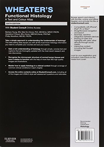 Now in its seventh edition, Wheater’s Functional Histology is designed to give students a working knowledge of histology, including the basic histological structures, tissue types and organ systems. You will learn to recognise the microscopic structure of normal human tissues and understand how this relates to function. The book shows you how to apply histology in a clinical context through coverage of common clinical conditions in each chapter. This must-have book is written clearly and concisely, designed for those studying histology for the first time. Packed with a wealth of illustrations and learning aids, it is a must-have for every medical and health science student. Concise and easy to digest text – easy to follow for those new to histology More than 900 high quality histology images and illustrations, plus detailed explanations to support understanding End of chapter review tables summarising important points Self-assessment questions and rationales to support exam preparation Appendix outlining the basics of microscopy and histological staining techniques Basic glossary An enhanced eBook version is included with purchase. The eBook allows you to access all the text, figures and references, with the ability to search, customize your content, make notes and highlights, and have content read aloud More clinical correlation boxes More clinical images More questions added