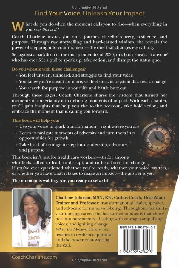 Find Your Voice, Unleash Your Impact What do you do when the moment calls you to rise–when everything in you says this is it? Coach Charlene, Caritas Coach and HeartMath trainer/professor, invites you on a journey of self-discovery, resilience, and purpose. Through raw storytelling and hard-earned wisdom, she reveals the power of stepping into your moment–the one that changes everything. Set against a backdrop of the dual pandemics of 2020, this book speaks to anyone who has ever felt a pull to speak up, take action, and disrupt the status quo. Do you wrestle with these challenges? You feel unseen, unheard, and struggle to find your voice You know you’re meant for more, yet feel stuck in a system that resists change You search for purpose in your life and battle burnout Through these pages, Coach Charlene shares the wisdom that turned her moments of uncertainty into defining moments of impact. With each chapter, you’ll gain insights that help you rise to the occasion, take bold action, and embrace the moment that is calling you forward. This book will help you: Use your voice to spark transformation–right where you are Learn to navigate moments of adversity and turn them into opportunities for growth Take hold of courage to step into leadership, advocacy, and purpose This book isn’t just for healthcare workers–it’s for anyone who feels called to lead, to disrupt, and to be a force for change. If you’ve ever questioned whether you’re ready, whether your voice matters, or whether you have what it takes to make an impact–the answer is yes. The moment is waiting. Are you ready to seize it?