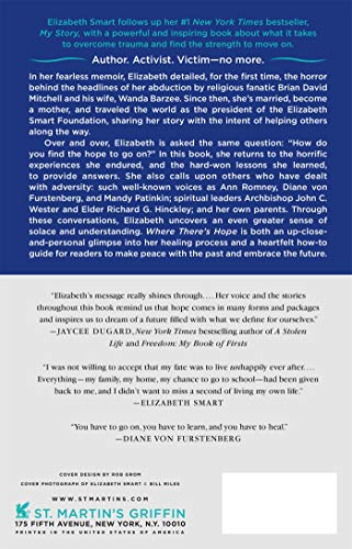 Elizabeth Smart follows up her #1 New York Times bestseller (October 2013), My Story–about being held in captivity as a teenager, and how she managed to survive–with a powerful and inspiring book about what it takes to overcome trauma, find the strength to move on, and reclaim one’s life. Author. Activist. Victim–no more. In her fearless memoir, My Story–the basis of the Lifetime Original movie I Am Elizabeth Smart–Elizabeth detailed, for the first time, the horror behind the headlines of her abduction by religious fanatic Brian David Mitchell and his wife, Wanda Barzee. Since then, she’s married, become a mother, and travelled the world as the president of the Elizabeth Smart Foundation, sharing her story with the intent of helping others along the way. Over and over, Elizabeth is asked the same question: How do you find the hope to go on? In this book, Elizabeth returns to the horrific experiences she endured, and the hard-won lessons she learned, to provide answers. She also calls upon others who have dealt with adversity–victims of violence, disease, war, and loss–to explore the pathways toward hope. Through conversations with such well-known voices as Anne Romney, Diane von Furstenburg, and Mandy Patinkin to spiritual leaders Archbishop John C. Wester and Elder Richard Hinckley to her own parents, Elizabeth uncovers an even greater sense of solace and understanding. Where There’s Hope is the result of Elizabeth’s mission: It is both an up-close-and-personal glimpse into her healing process and a heartfelt how-to guide for readers to make peace with the past and embrace the future. From the book: “I was not willing to accept that my fate was to live unhappily ever after. Everything–my family, my home, my chance to go to school–had been given back to me, and I didn’t want to miss a second chance of living my own life.” –Elizabeth Smart “There are two types of survivors: the ones who did not die, and the ones who live. There will be those who will always remember and be the victim, and ones who just won’t. You have to go on, you have to learn, and you have to heal.” –Diane von Furstenberg