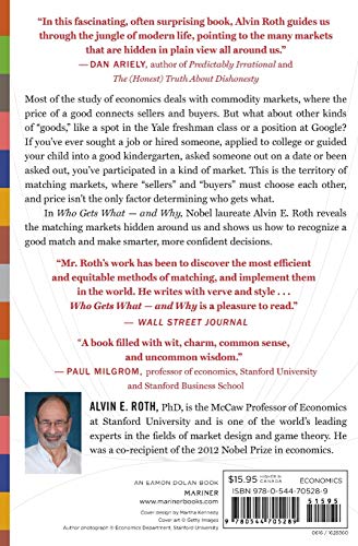 “In his fluent and accessible book, Mr. Roth vividly describes the successes of market design.” — Economist.com? “In this fascinating, often surprising book, Alvin Roth guides us through the jungles of modern life, pointing to the many markets that are hidden in plain view all around us.” — Dan Ariely, author of Predictably Irrational and The (Honest) Truth About Dishonesty Most of the study of economics deals with commodity markets, where the price of a good connects sellers and buyers. But what about other kinds of “goods,” like a spot in the Yale freshman class or a position at Google? If you’ve ever sought a job or hired someone, applied to college or guided your child into a good kindergarten, asked someone out on a date or been asked out, you’ve participated in a kind of market. This is the territory of matching markets, where “sellers” and “buyers” must choose each other, and price isn’t the only factor determining who gets what. In Who Gets What–and Why, Nobel laureate Alvin E. Roth reveals the matching markets hidden around us and shows us how to recognize a good match and make smarter, more confident decisions. “Mr. Roth’s work has been to discover the most efficient and equitable methods of matching, and implement them in the world. He writes with verve and style . . . Who Gets What–and Why is a pleasure to read.” — Wall Street Journal “A book filled with wit, charm, common sense, and uncommon wisdom.” — Paul Milgrom, professor of economics, Stanford University and Stanford Business School
