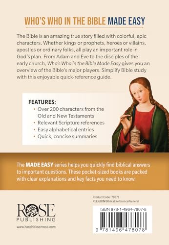 From Abraham to Zipporah, this fascinating handbook is packed with illustrations and summaries, giving an overview of over 200 of the Bible’s most important people! This handy compact resource features: Over 200 characters from the Old and New Testaments Relevant Scripture references Easy alphabetical entries Quick, concise summaries There are hundreds of fascinating people in the Bible with epic stories and legacies, but you only have so much time! Who’s Who in the Bible Made Easy compiles all the need-to-know information and scripture references in an easy-to-use format! Instead of flipping through a heavy index, concordance, and back and forth in your Bible, this pocket-sized handbook makes it easy for you to look up the top 200 characters and get a detailed understanding of who they are–all in the palm of your hand. Who’s Who in the Bible Made Easy Covers Over 200 Key People! It’s never been more fascinating or convenient to learn about the key people in the Bible and God’s plans for them! Alphabetical entries cover important information about main characters from the Old and New Testaments, from Adam to the apostles. Makes an excellent Bible-study aid for looking up key facts about the patriarchs, prophets, important kings, and other major players in the Old Testament, as well as who’s who in the Gospels and Epistles. Old and New Testament Heroes Abraham Samson Paul And more! Kings & Queens David Vashti Nebuchadnezzar And more! Prophets Daniel Elijah Nathan And more! Supernatural Figures Michael the Archangel Satan Beelzebul And more! Women of the Bible Deborah Ruth Delilah And more! Disciples Thomas Bartholomew Judas And more! Perfect for individual and group study, church libraries, Sunday school classes, missionaries, and more! Key Features of Who’s Who in the Bible Made Easy Handbook Easy-to-Understand Overview. Designed using clear and organized headers and in alphabetical order, this handbook features 200 key people in the Bible. Full-Color Illustrations. Enjoy having visual aids to assist in your Bible study of Who’s Who in the Bible. Reference-Friendly. Easily find the scripture verses that cover each person of the Bible at your fingertips. Well-Researched. Enjoy having easy-to-read overviews to help you grasp the need-to-know details on key Bible people. Pocket-Sized. Whether you keep it in your pocket, purse, book bag, or car, you’ll be stunned at how much practical information is packed into this travel-sized handbook! Perfect for: Group and individual Bible study Sunday school Youth groups New believers classes Church libraries Discipleship And more! About the Made Easy Series: The Made Easy series helps you quickly find biblical answers to important questions. These pocket-sized books are packed with clear explanations and key facts you need to know. Perfect for individual and group study, church libraries, Sunday school classes, missionaries, and more! Easily glean lots of information with the highly visual format you’ve come to expect from Rose, including full-color charts, maps, and illustrations.