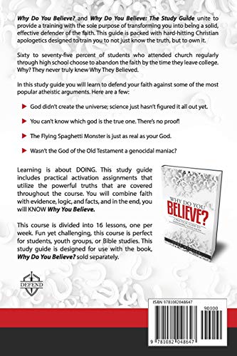 Why Do You Believe: The Study Guide is the companion to the book, Why Do You Believe. Combined, these resources form a robust training program built to convert head knowledge into practical, hard-hitting belief in God that cannot be shaken. With 16 weeks of material, Why Do You Believe: The Study Guide is a fun yet challenging resource for serious Bible study groups, homeschool curriculum, youth groups or family study for parents and their teens. Do you know how to answer these questions from an atheist? No God exists. There is no proof! How do you know your God is the right one? Have you disproven all the other gods? How can the Bible be the Word of God if there are so many contradictions in it? Didn’t the God of the Old Testament murder women and children? And you say He’s good and loving?If you can’t answer these questions, doubt can creep in and challenge your faith. This curriculum contains these answers and more. Beyond that, students implement role-playing exercises to force them to apply what they learned. Learning + Doing = Transformation Students read, watch videos, engage in conversations, and challenge everything they have ever known to truly know Why They Believe. Note: Why Do You Believe: The Answer Key provides suggested answers for this study guide to assist leaders and teachers. The Answer Key is available on Amazon or email [email protected] for more information