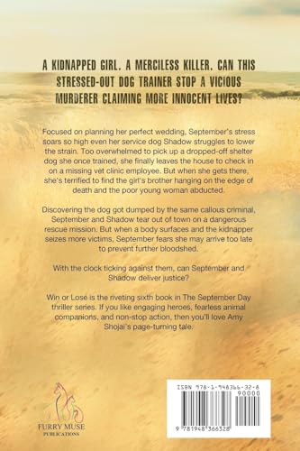 “Colorful characters, including the unusual perspective of Shadow the dog, make this series an enjoyable read for any animal lover.” ~Toby Neal, USA TODAY Bestselling Author of the Paradise Crime Mysteries & Thrillers A kidnapped girl. A merciless killer. Can this stressed-out dog trainer stop a callous murderer claiming innocent lives? September Day can’t shake her mounting wedding-planning angst. Too overwhelmed to pick up a dropped-off shelter dog she once trained, she finally leaves the house to check in on a missing vet clinic employee. But when she gets there, she’s terrified to find the girl’s brother hanging on the edge of death and the poor young woman abducted. Discovering the hound got dumped by the same vicious criminal, September and Shadow race out of town on a dangerous rescue mission. But when a body surfaces and the kidnapper seizes more victims, September fears she may be too late to prevent further bloodshed. With the clock ticking against them, can September and Shadow deliver justice? Win or Lose is the riveting sixth book in The September Day thriller series. If you like engaging heroes, fearless animal companions, and non-stop action, then you’ll love Amy Shojai’s page-turning tale. Buy Win or Lose to play a deadly game today!
