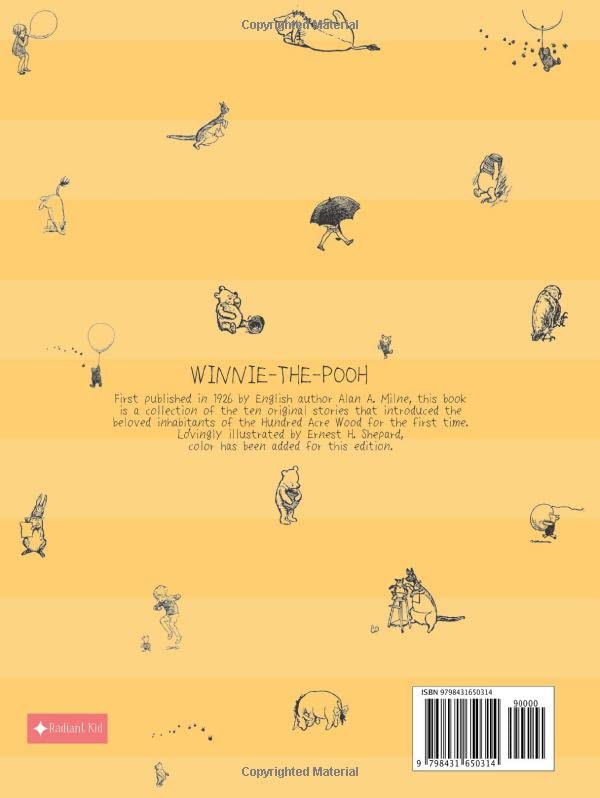 Original 1926 text 114 original colorized illustrations Easy read with large 16pt font in fun handwritten inspired style (printed version) White paper 8.25 x 11 inches Gloss cover 110 pages Rediscover the delightful ten original adventures of Winnie The Pooh, Christopher Robin, Piglet, Rabbit, Owl, Eeyore, Kanga and Roo that Alan A. Milne wrote inspired by his son Christopher Robin and his stuffed animals. For this edition the beloved illustrations by Ernest H. Shepard have received digital color. Celebrate this children’s literary classic 96 year legacy with Pooh at the Hundred Acre Wood. Full of charming humor it’s a great story to gift the children or young at heart in your life or for yourself! Get it now!