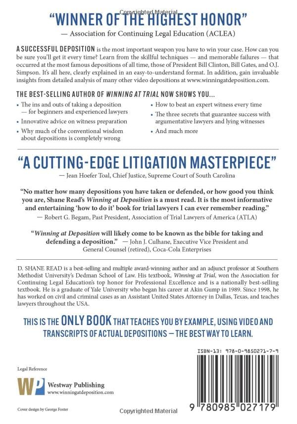 Winning at Deposition won the highest award available for legal publications: ACLEA’s Award for Professional Excellence. The book won first prize from a field of over 300 entries submitted by continuing legal education publishers from across the USA. Written by the best-selling author of Turning Points at Trial, this book shows beginning and experienced attorneys how to win at deposition every time. With the first chapter explaining all the ins and outs of taking and defending a deposition, the remainder of the book reveals strategies that will help every lawyer vastly improve his deposition skills. Discover why much of the conventional wisdom about depositions is completely wrong, learn how to beat an expert witness every time, get innovative advice on witness preparation, and master the secrets that guarantee success with argumentative lawyers and lying witnesses. Unlike any other book, this one teaches from transcripts and videos of actual depositions. You will learn from the skillful techniques—and memorable failures—that occurred at the most famous depositions of all time, those of President Bill Clinton, Bill Gates, and O.J. Simpson. It’s all here, clearly explained in an easy-to-understand format. In addition, the book provides detailed analysis of video depositions located at the book’s website www.winningatdeposition.com.